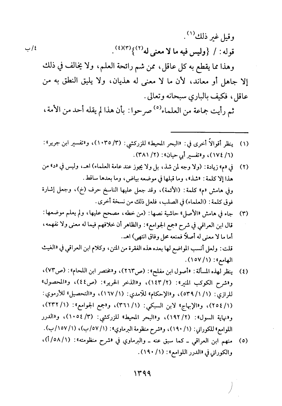 وَهَذَا مِمَّا يقطع بِهِ كل عَاقل، مِمَّن شم رَائِحَة الْعلم، وَلَا يُخَالف فِي ذَلِك إِلَّا جَاهِل أَو معاند، لِأَن مَا لَا معنى لَهُ هذيان، وَلَا يَلِيق النُّطْق بِهِ من عَاقل، فَكيف بالباري سُبْحَانَهُ وَتَعَالَى.