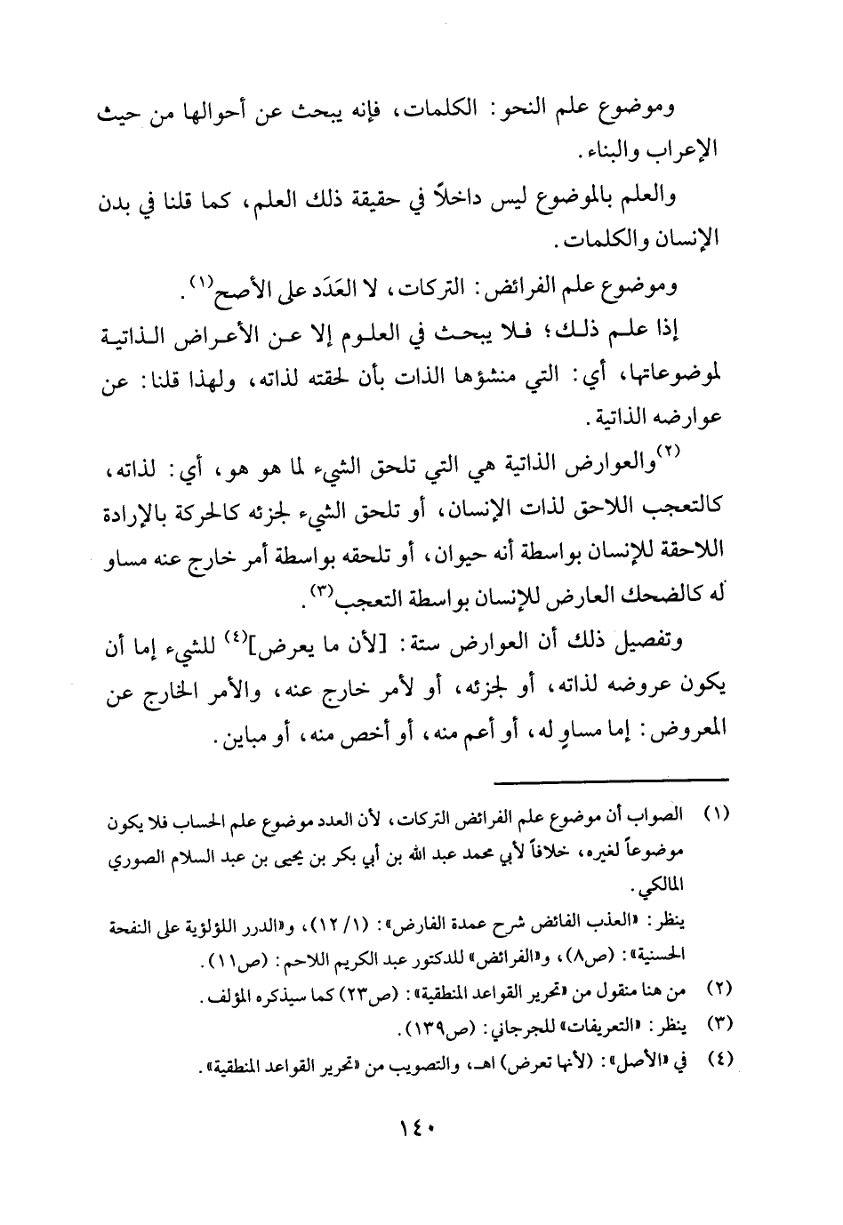 والعوارض الذاتية هِيَ الَّتِي تلْحق الشَّيْء لما هُوَ هُوَ، أَي: لذاته، كالتعجب اللَّاحِق لذات الْإِنْسَان، أَو تلْحق الشَّيْء لجزئه كالحركة بالإرادة اللاحقة للْإنْسَان بِوَاسِطَة أَنه حَيَوَان، أَو تلْحقهُ بِوَاسِطَة أَمر خَارج عَنهُ مسَاوٍ لَهُ كالضحك الْعَارِض للْإنْسَان بِوَاسِطَة التَّعَجُّب.
