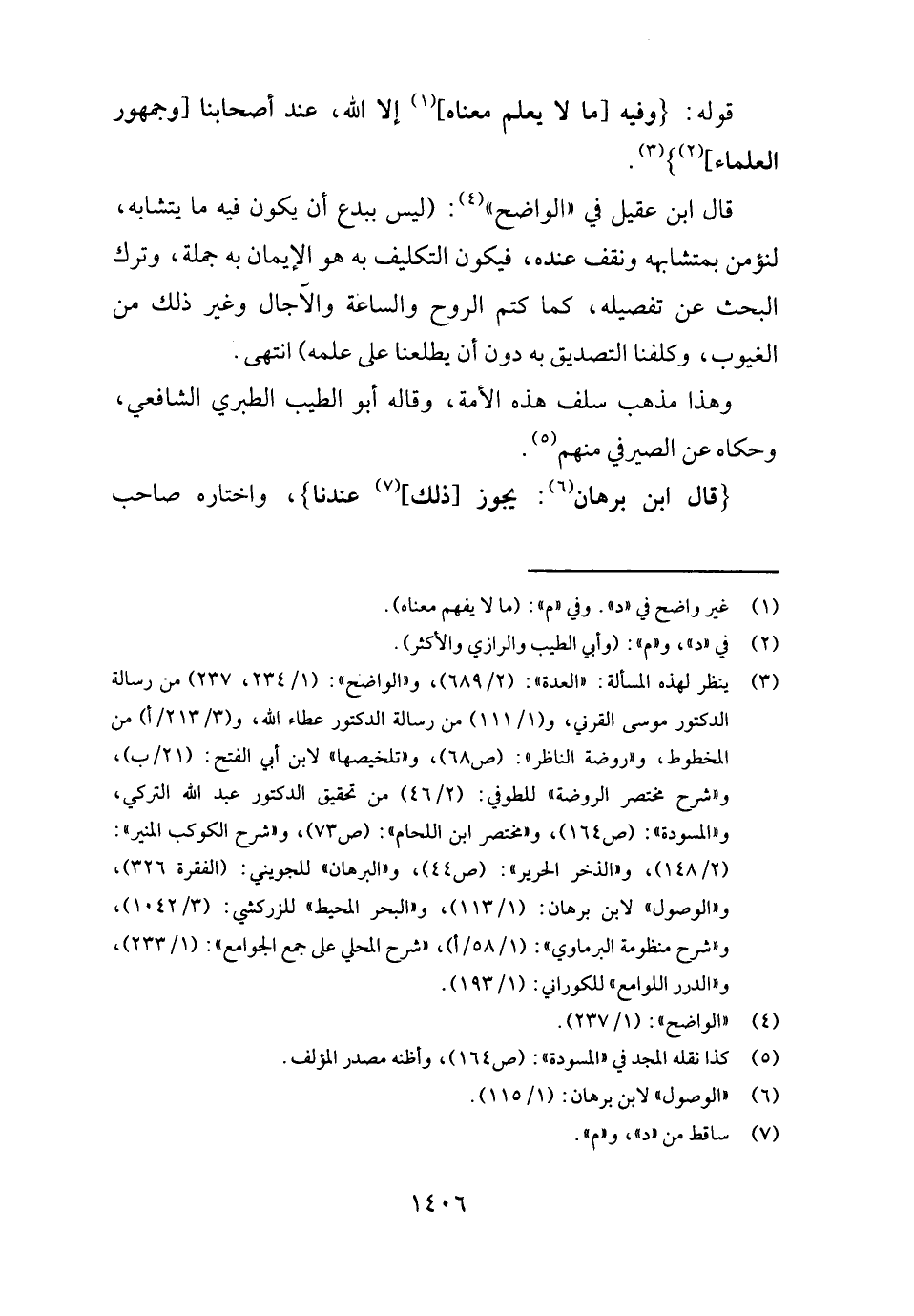 قَالَ ابْن عقيل فِي " الْوَاضِح ": (لَيْسَ ببدع أَن يكون فِيهِ مَا يتشابه، لنؤمن بمتشابهه ونقف عِنْده، فَيكون التَّكْلِيف بِهِ هُوَ الْإِيمَان بِهِ جملَة، وَترك الْبَحْث عَن تَفْصِيله، كَمَا كتم الرّوح والساعة والآجال وَغير ذَلِك من الغيوب، وكلفنا التَّصْدِيق بِهِ دون أَن يطلعنا على علمه) انْتهى.