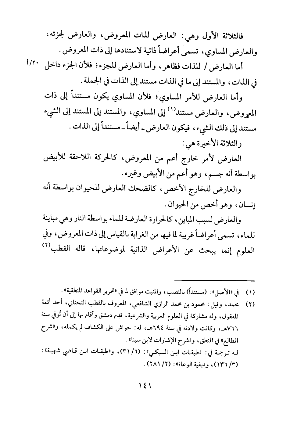 وَأما الْعَارِض لِلْأَمْرِ الْمسَاوِي؛ فَلِأَن الْمسَاوِي يكون مُسْتَندا إِلَى ذَات المعروض، والعارض مُسْتَند إِلَى الْمسَاوِي، والمستند إِلَى الْمُسْتَند إِلَى الشَّيْء مُسْتَند إِلَى ذَلِك الشَّيْء، فَيكون الْعَارِض - أَيْضا - مُسْتَندا إِلَى الذَّات.