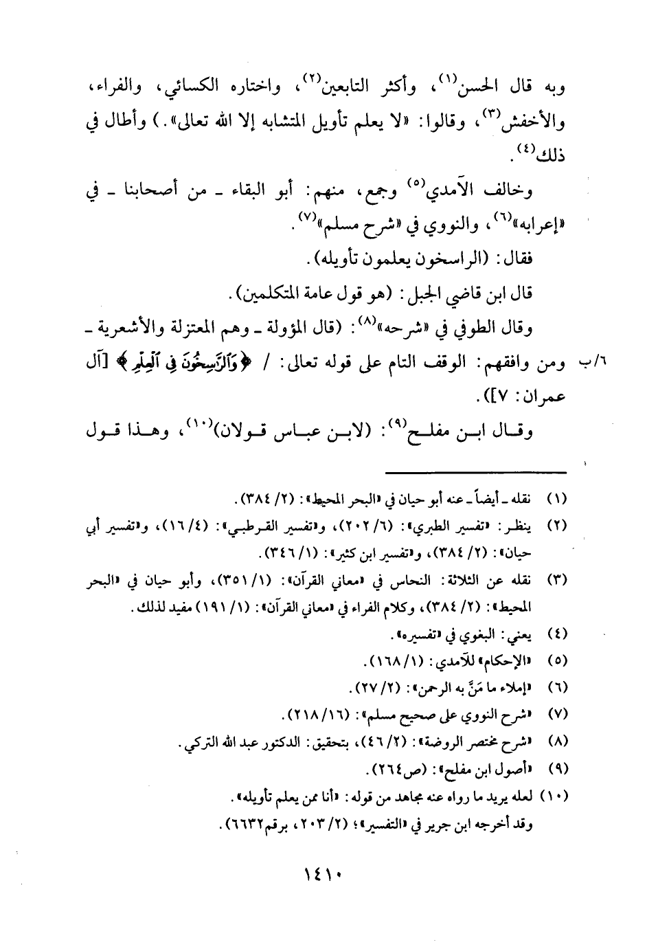 وَبِه قَالَ الْحسن، وَأكْثر التَّابِعين، وَاخْتَارَهُ الْكسَائي، وَالْفراء، والأخفش، وَقَالُوا: " لَا يعلم تَأْوِيل الْمُتَشَابه إِلَّا الله تَعَالَى ") . وَأطَال فِي ذَلِك.