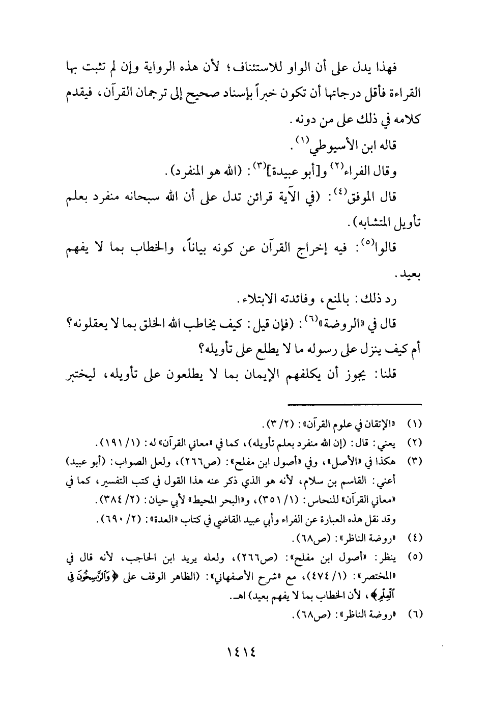 قَالَ الْمُوفق: (فِي الْآيَة قَرَائِن تدل على أَن الله سُبْحَانَهُ مُنْفَرد بِعلم تَأْوِيل الْمُتَشَابه) .