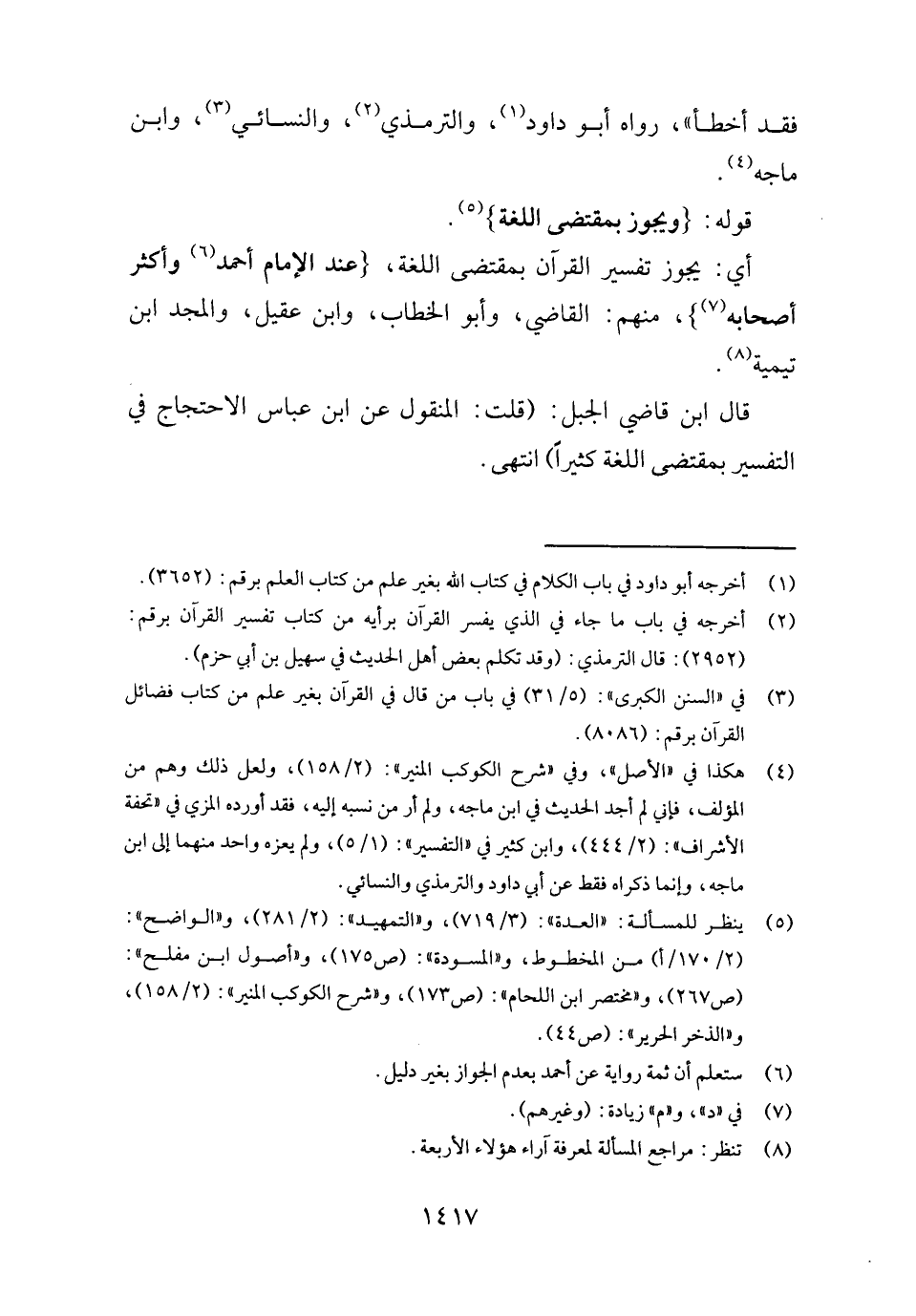 أَي: يجوز تَفْسِير الْقُرْآن بِمُقْتَضى اللُّغَة، {عِنْد الإِمَام أَحْمد وَأكْثر أَصْحَابه} ، مِنْهُم: القَاضِي، وَأَبُو الْخطاب، وَابْن عقيل، وَالْمجد ابْن تَيْمِية.