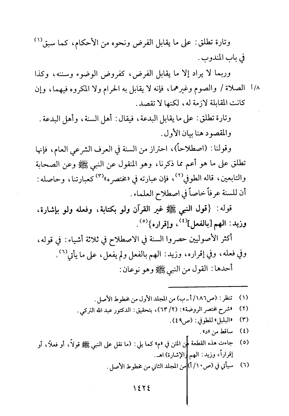 وَقَوْلنَا: (اصْطِلَاحا) ، احْتِرَاز من السّنة فِي الْعرف الشَّرْعِيّ الْعَام، فَإِنَّهَا تطلق على مَا هُوَ أَعم مِمَّا ذكرنَا، وَهُوَ الْمَنْقُول عَن النَّبِي - صَلَّى اللَّهُ عَلَيْهِ وَسَلَّم َ - وَعَن الصَّحَابَة وَالتَّابِعِينَ، قَالَه الطوفي، فَإِن عِبَارَته فِي " مُخْتَصره " كعبارتنا، وَحَاصِله: أَن للسّنة عرفا خَاصّا فِي اصْطِلَاح الْعلمَاء.