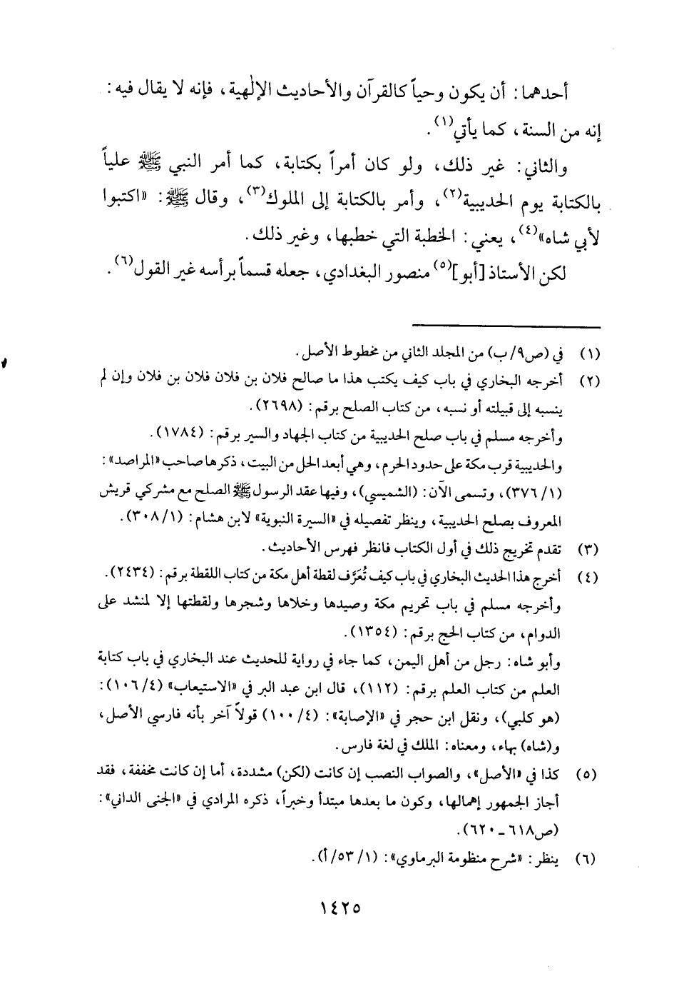 أَحدهمَا: أَن يكون وَحيا كالقرآن وَالْأَحَادِيث الإلهية، فَإِنَّهُ لَا يُقَال فِيهِ: إِنَّه من السّنة، كَمَا يَأْتِي.