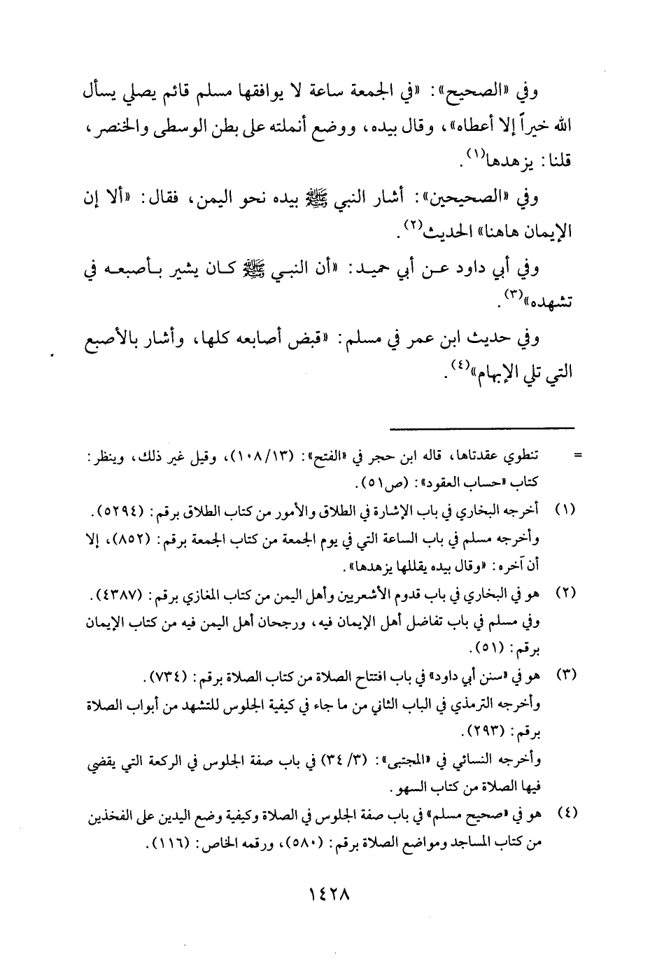 وَفِي حَدِيث ابْن عمر فِي مُسلم: " قبض أَصَابِعه كلهَا، وَأَشَارَ بالأصبع الَّتِي تلِي الْإِبْهَام ".
