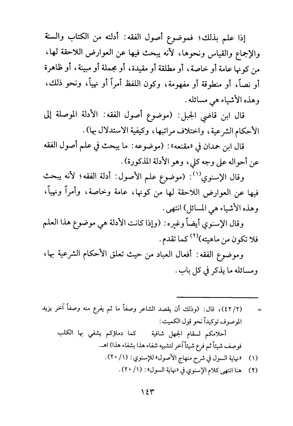 قَالَ ابْن حمدَان فِي " مقنعه ": (مَوْضُوعه: مَا يبْحَث فِي علم أصُول الْفِقْه عَن أَحْوَاله على وَجه كلي، وَهُوَ الْأَدِلَّة الْمَذْكُورَة) .