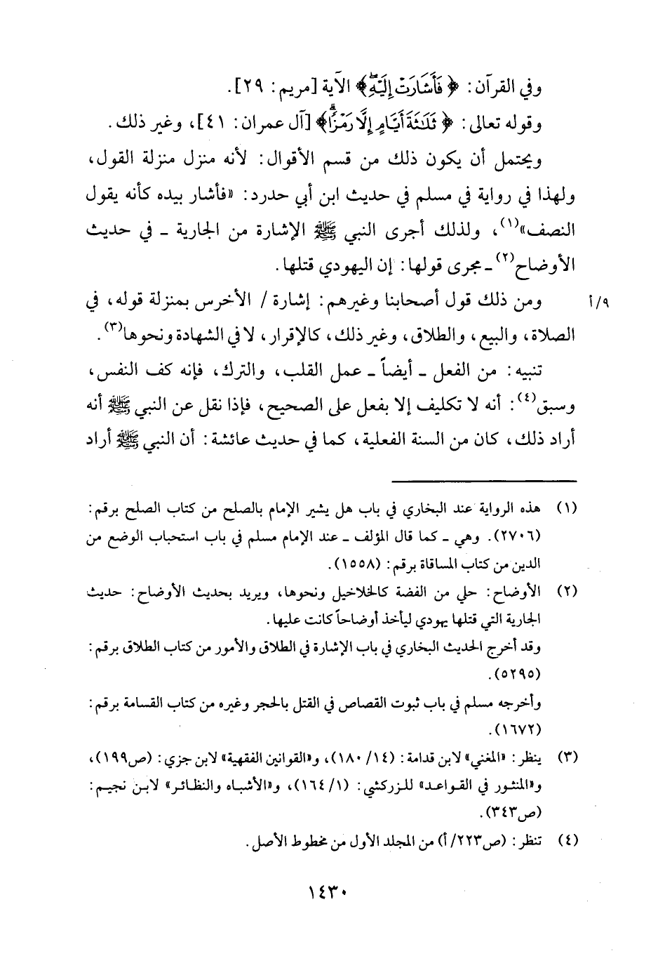 وَمن ذَلِك قَول أَصْحَابنَا وَغَيرهم: إِشَارَة الْأَخْرَس بِمَنْزِلَة قَوْله، فِي الصَّلَاة، وَالْبيع، وَالطَّلَاق، وَغير ذَلِك، كَالْإِقْرَارِ، لَا فِي الشَّهَادَة وَنَحْوهَا.