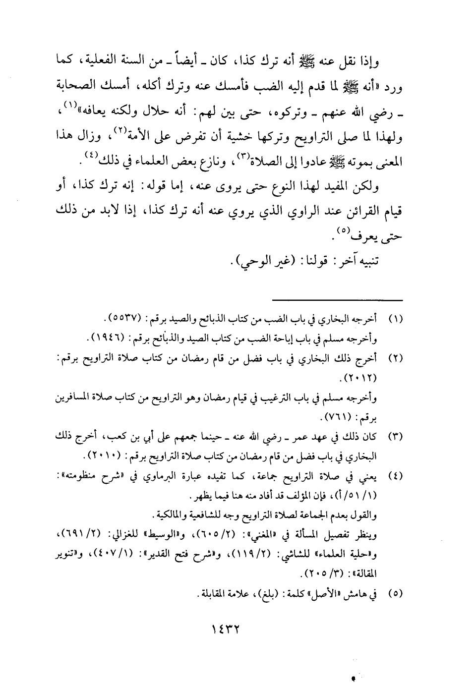 وَإِذا نقل عَنهُ - صَلَّى اللَّهُ عَلَيْهِ وَسَلَّم َ - أَنه ترك كَذَا، كَانَ - أَيْضا - من السّنة الفعلية، كَمَا ورد " أَنه - صَلَّى اللَّهُ عَلَيْهِ وَسَلَّم َ - لما قدم إِلَيْهِ الضَّب فَأمْسك عَنهُ وَترك أكله، أمسك الصَّحَابَة - رَضِي الله عَنْهُم - وتركوه، حَتَّى بَين لَهُم: أَنه حَلَال وَلكنه يعافه "، وَلِهَذَا لما صلى التَّرَاوِيح وَتركهَا خشيَة أَن تفرض على الْأمة، وَزَالَ هَذَا الْمَعْنى بِمَوْتِهِ - صَلَّى اللَّهُ عَلَيْهِ وَسَلَّم َ - عَادوا إِلَى الصَّلَاة، وَنَازع بعض الْعلمَاء فِي ذَلِك.