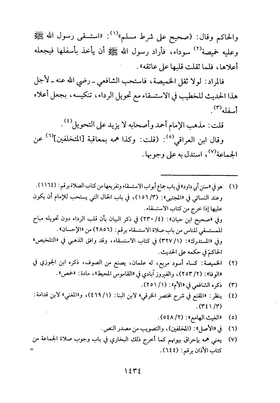 وَالْحَاكِم وَقَالَ: (صَحِيح على شَرط مُسلم) : " استسقى رَسُول الله - صَلَّى اللَّهُ عَلَيْهِ وَسَلَّم َ - وَعَلِيهِ خميصة سَوْدَاء، فَأَرَادَ رَسُول الله - صَلَّى اللَّهُ عَلَيْهِ وَسَلَّم َ - أَن يَأْخُذ بأسفلها فَيَجْعَلهُ أَعْلَاهَا، فَلَمَّا ثقلت قَلبهَا على عَاتِقه ".
