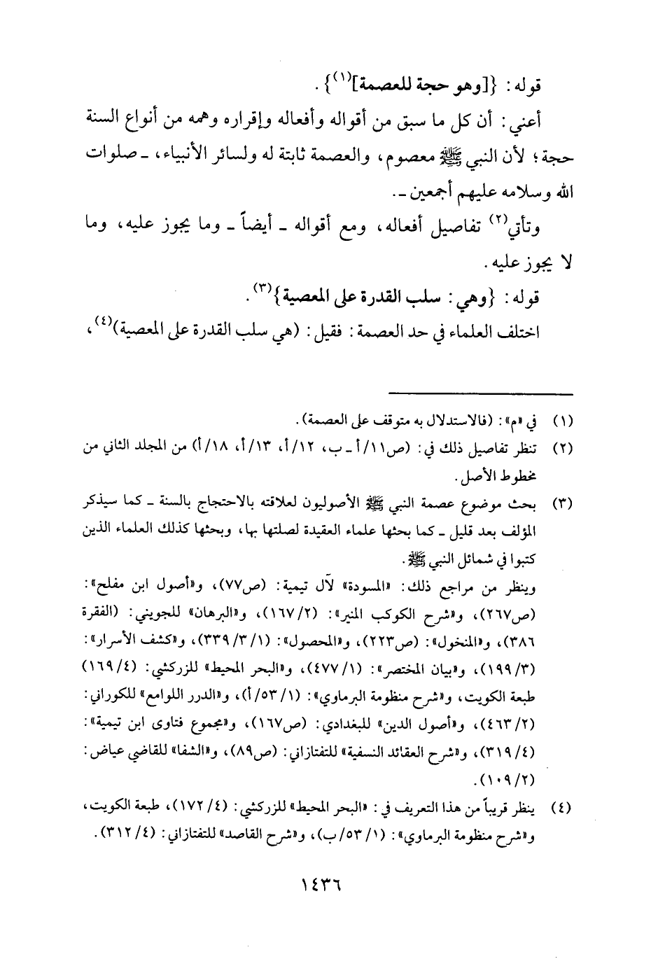 اخْتلف الْعلمَاء فِي حد الْعِصْمَة: فَقيل: (هِيَ سلب الْقُدْرَة على الْمعْصِيَة) ،