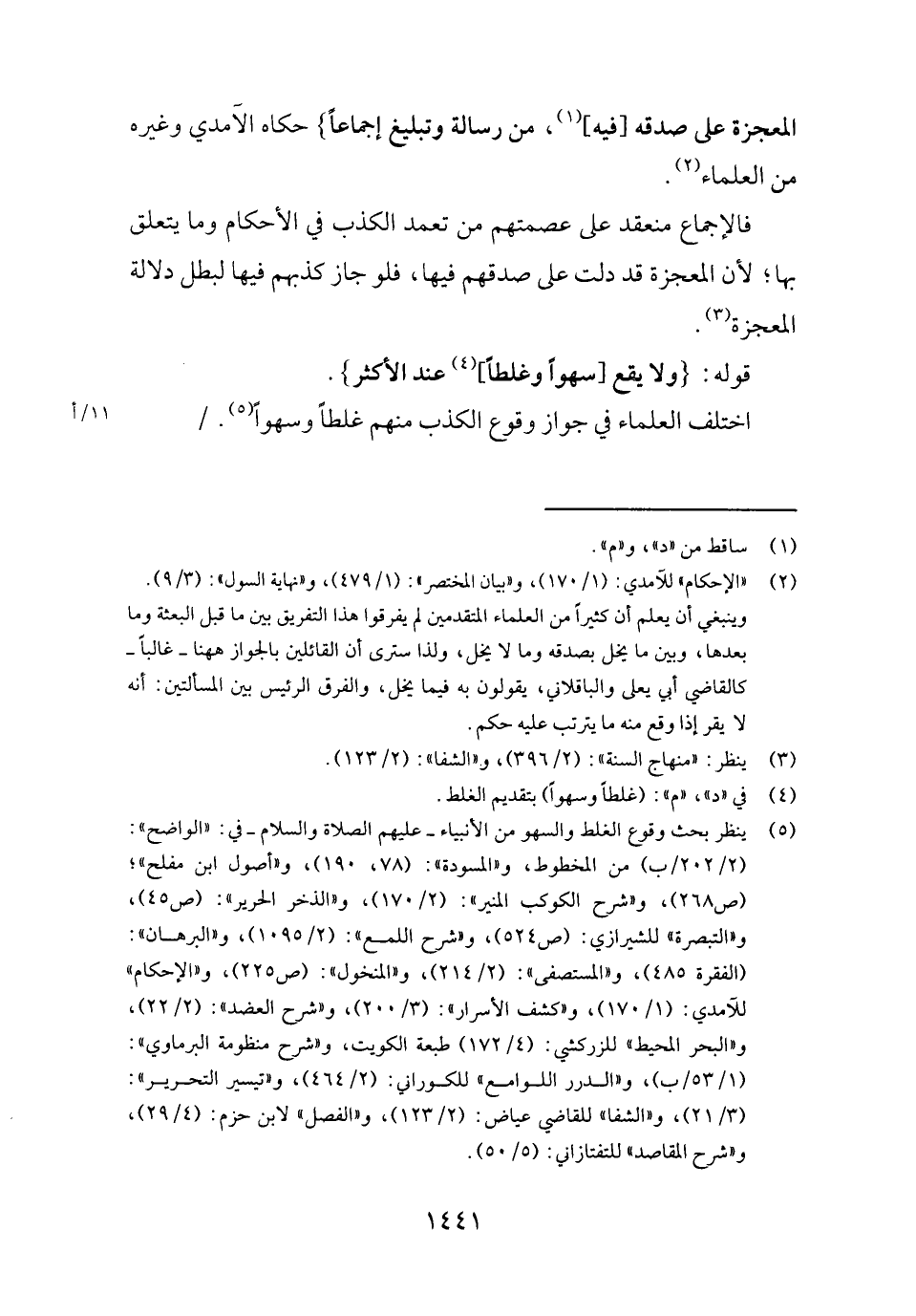 المعجزة على صدقه [فِيهِ] ، من رِسَالَة وتبليغ إِجْمَاعًا} حَكَاهُ الْآمِدِيّ وَغَيره من الْعلمَاء.