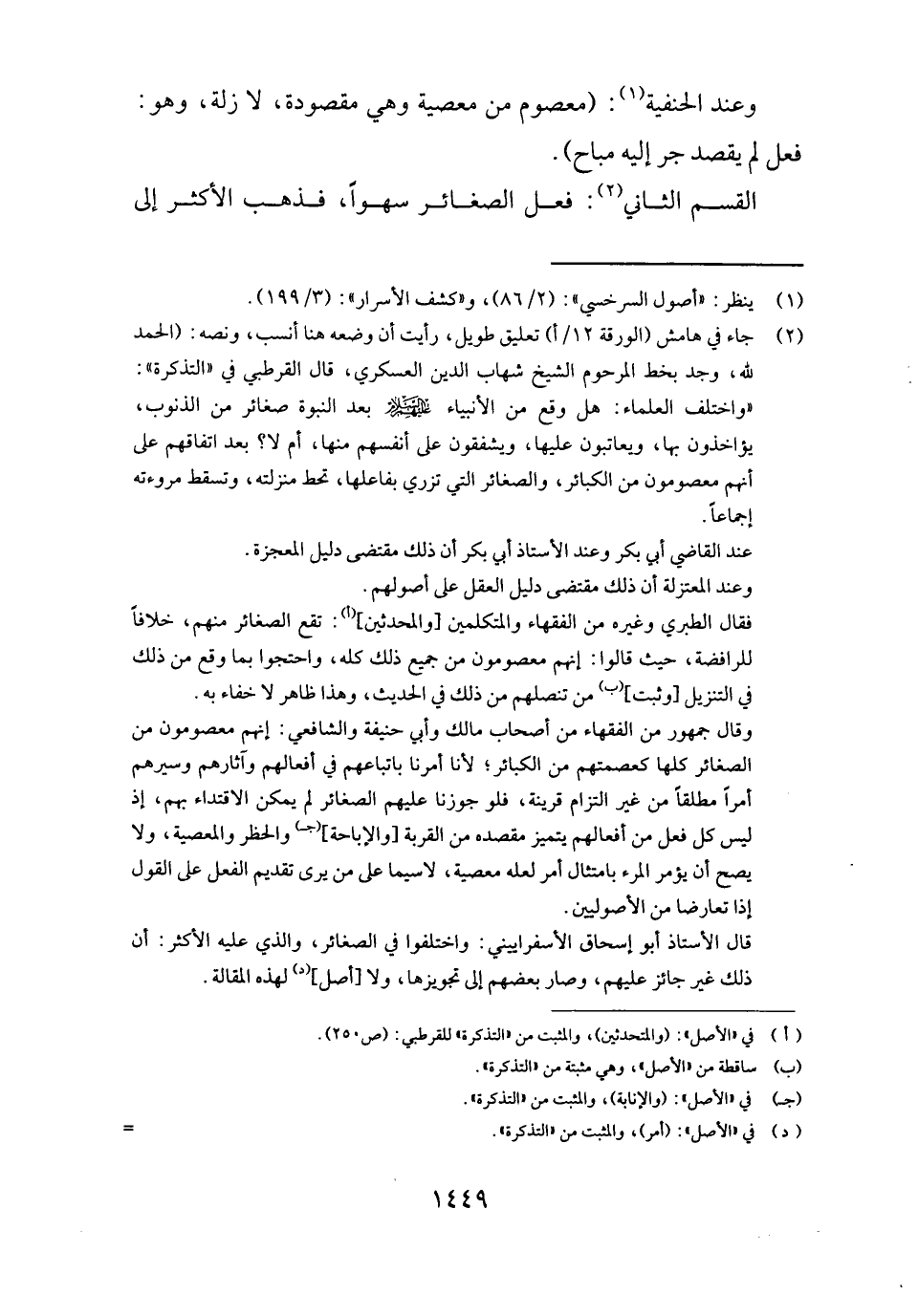 وَعند الْحَنَفِيَّة: (مَعْصُوم من مَعْصِيّة وَهِي مَقْصُودَة، لَا زلَّة، وَهُوَ: فعل لم يقْصد جر إِلَيْهِ مُبَاح) .