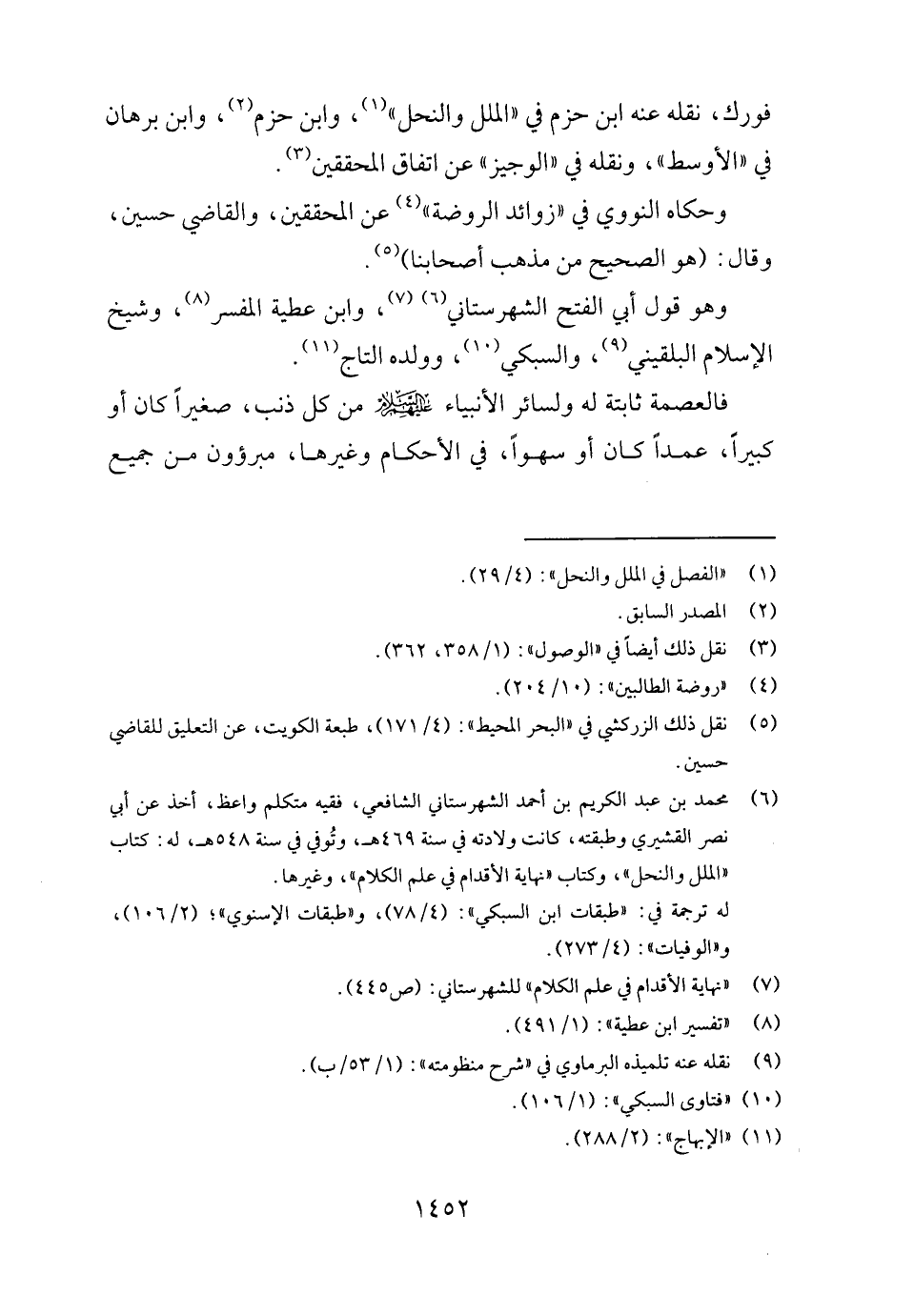 فالعصمة ثَابِتَة لَهُ ولسائر الْأَنْبِيَاء عَلَيْهِم السَّلَام من كل ذَنْب، صَغِيرا كَانَ أَو كَبِيرا، عمدا كَانَ أَو سَهوا، فِي الْأَحْكَام وَغَيرهَا، مبرؤون من جَمِيع