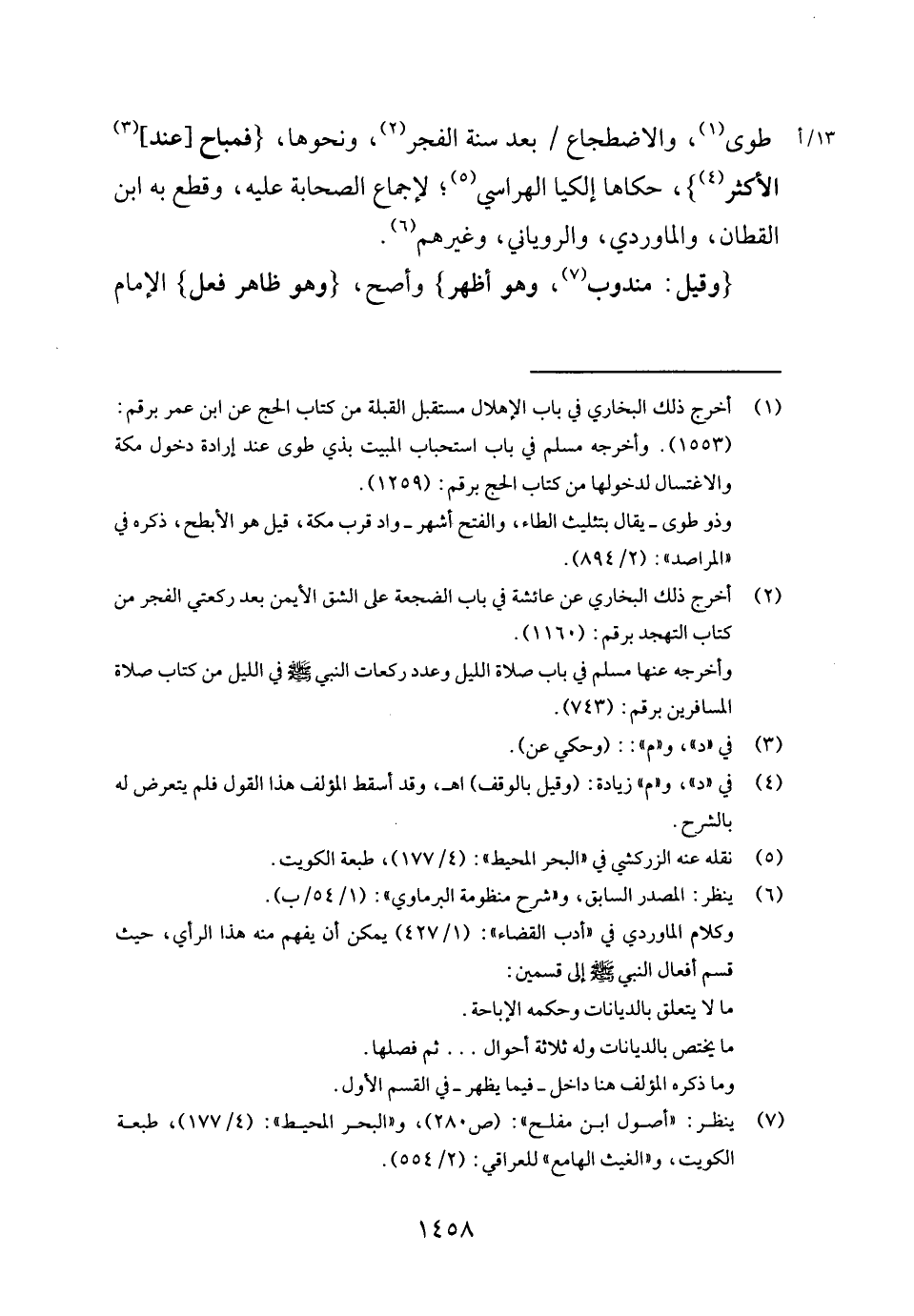 طوى، والاضطجاع بعد سنة الْفجْر، وَنَحْوهَا، {فمباح [عِنْد] الْأَكْثَر} ، حَكَاهَا إِلْكيَا الهراسي؛ لإِجْمَاع الصَّحَابَة عَلَيْهِ، وَقطع بِهِ ابْن الْقطَّان، وَالْمَاوَرْدِيّ، وَالرُّويَانِيّ، وَغَيرهم.