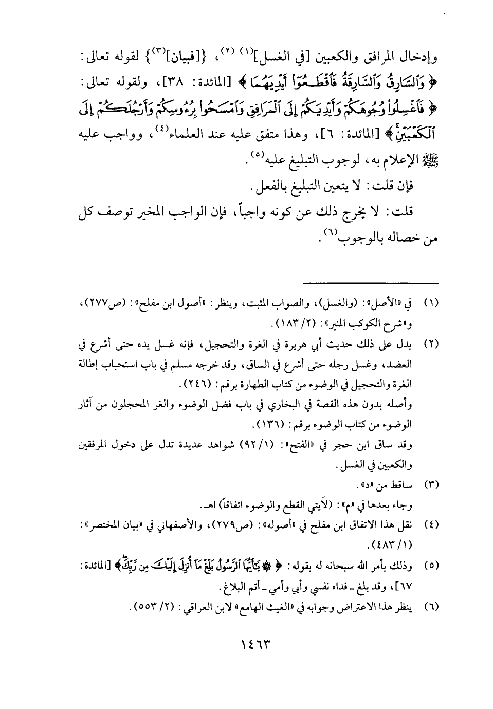 وَإِدْخَال الْمرَافِق والكعبين [فِي الْغسْل] ، { [فبيان] } لقَوْله تَعَالَى: {وَالسَّارِق والسارقة فَاقْطَعُوا أَيْدِيهِمَا} [الْمَائِدَة: ٣٨] ، وَلقَوْله تَعَالَى: {فَاغْسِلُوا وُجُوهكُم وَأَيْدِيكُمْ إِلَى الْمرَافِق وامسحوا برؤوسكم وأرجلكم إِلَى الْكَعْبَيْنِ} [الْمَائِدَة: ٦] ، وَهَذَا مُتَّفق عَلَيْهِ عِنْد الْعلمَاء، وواجب عَلَيْهِ - صَلَّى اللَّهُ عَلَيْهِ وَسَلَّم َ - الْإِعْلَام بِهِ، لوُجُوب التَّبْلِيغ عَلَيْهِ.