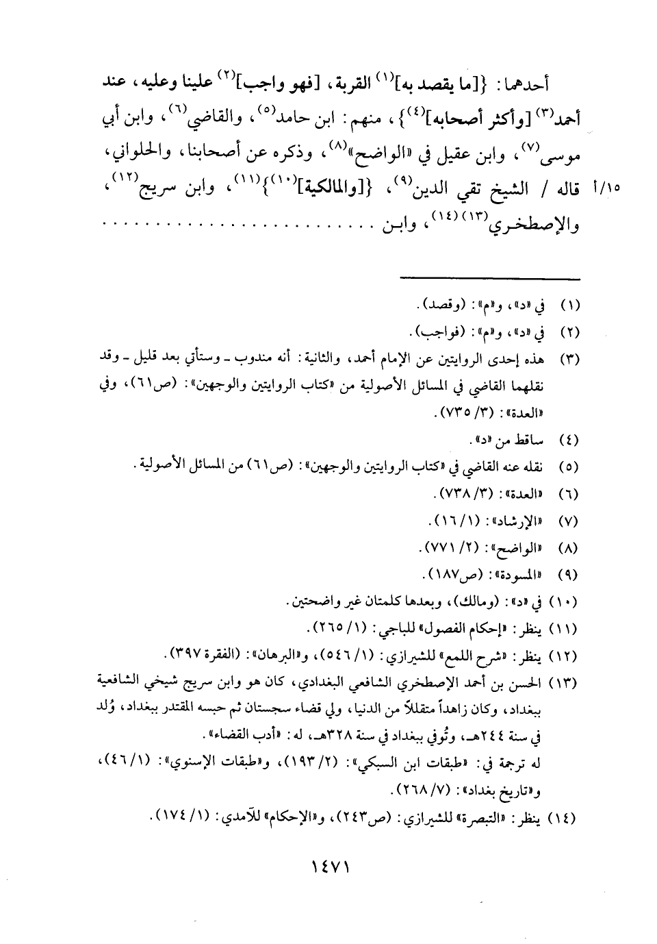 أَحدهمَا: { [مَا يقْصد بِهِ] الْقرْبَة، [فَهُوَ وَاجِب] علينا وَعَلِيهِ، عِنْد أَحْمد [وَأكْثر أَصْحَابه] } ، مِنْهُم: ابْن حَامِد، وَالْقَاضِي، وَابْن أبي مُوسَى، وَابْن عقيل فِي " الْوَاضِح "، وَذكره عَن أَصْحَابنَا، والحلواني، قَالَه الشَّيْخ تَقِيّ الدّين، { [والمالكية] } ، وَابْن سُرَيج، والإصطخري، وَابْن ... ... ... ... ... ... ... ... ... ... ...