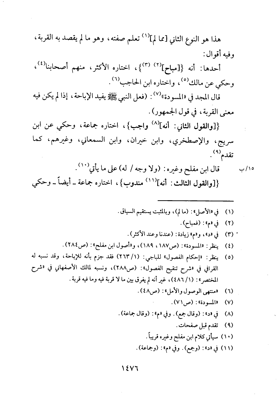 هَذَا هُوَ النَّوْع الثَّانِي [مِمَّا لم] تعلم صفته، وَهُوَ مَا لم يقْصد بِهِ الْقرْبَة، وَفِيه أَقْوَال: