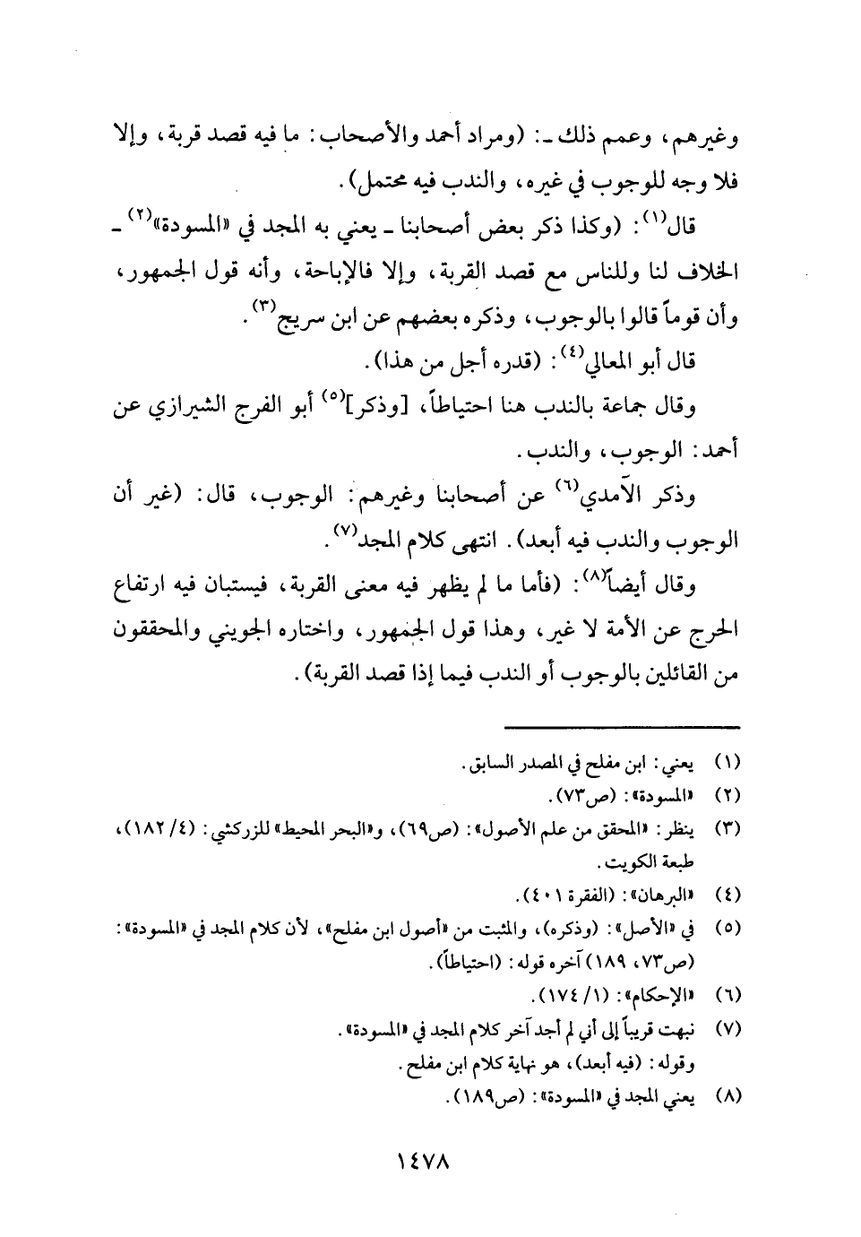 وَقَالَ أَيْضا: (فَأَما مَا لم يظْهر فِيهِ معنى الْقرْبَة، فيستبان فِيهِ ارْتِفَاع الْحَرج عَن الْأمة لَا غير، وَهَذَا قَول الْجُمْهُور، وَاخْتَارَهُ الْجُوَيْنِيّ والمحققون من الْقَائِلين بِالْوُجُوب أَو النّدب فِيمَا إِذا قصد الْقرْبَة) .
