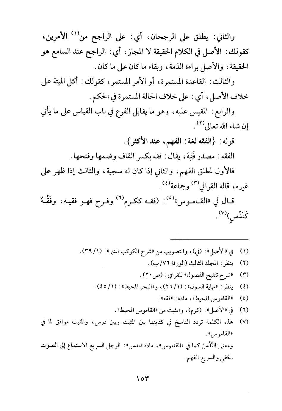 فَالْأول لمُطلق الْفَهم، وَالثَّانِي إِذا كَانَ لَهُ سجية، وَالثَّالِث إِذا ظهر على غَيره، قَالَه الْقَرَافِيّ وَجَمَاعَة. قَالَ فِي " الْقَامُوس ": (فقه ككرم وَفَرح فَهُوَ فَقِيه، وَفقه كندس) .