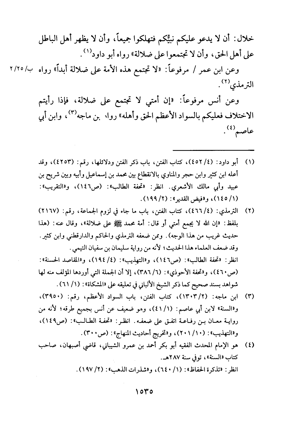 خلال: أَن لَا يَدْعُو عَلَيْكُم نَبِيكُم فَتَهْلكُوا جَمِيعًا، وَأَن لَا يظْهر أهل الْبَاطِل على أهل الْحق، وَأَن لَا تجتمعوا على ضَلَالَة " رَوَاهُ أَبُو دَاوُد.