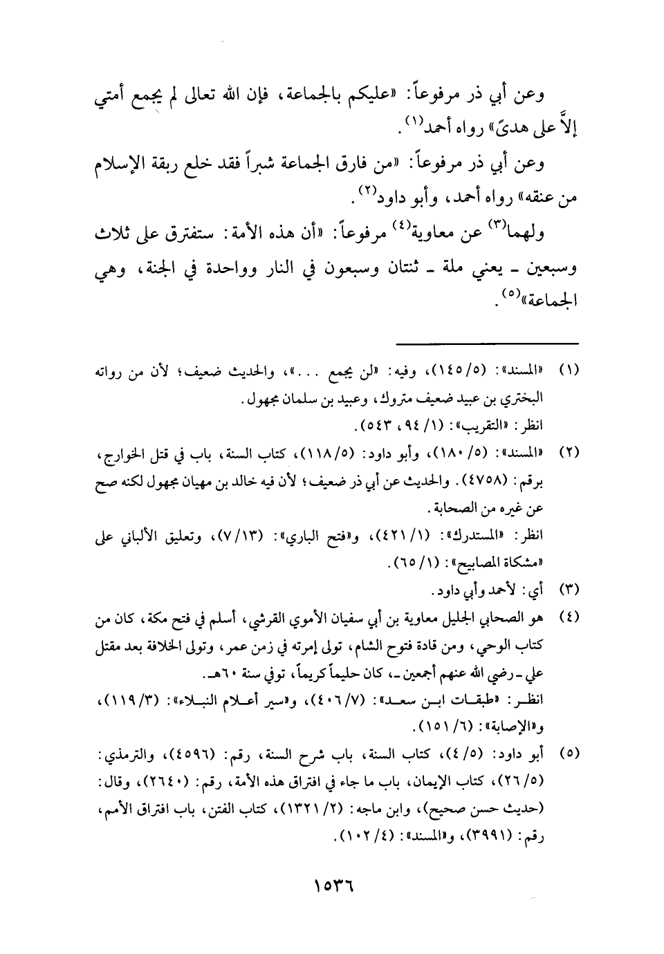 وَلَهُمَا عَن مُعَاوِيَة مَرْفُوعا: " أَن هَذِه الْأمة: سَتَفْتَرِقُ على ثَلَاث وَسبعين - يَعْنِي مِلَّة - ثِنْتَانِ وَسَبْعُونَ فِي النَّار وَوَاحِدَة فِي الْجنَّة، وَهِي الْجَمَاعَة ".