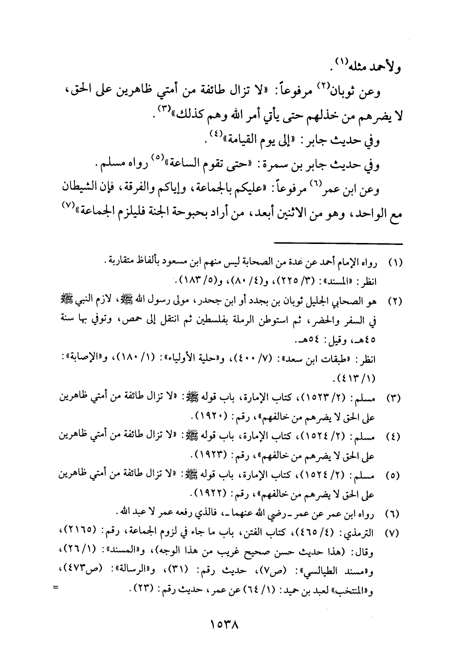 وَعَن ثَوْبَان مَرْفُوعا: " لَا تزَال طَائِفَة من أمتِي ظَاهِرين على الْحق، لَا يضرهم من خذلهم حَتَّى يَأْتِي أَمر الله وهم كَذَلِك ".