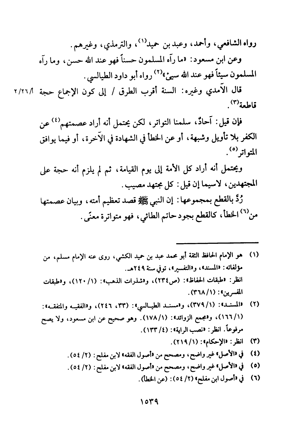 رد بِالْقطعِ بمجموعها: إِن النَّبِي - صَلَّى اللَّهُ عَلَيْهِ وَسَلَّم َ - قصد تَعْظِيم أمته، وَبَيَان عصمتها من الْخَطَأ، كالقطع بجود حَاتِم الطَّائِي، فَهُوَ متواترة معنى.