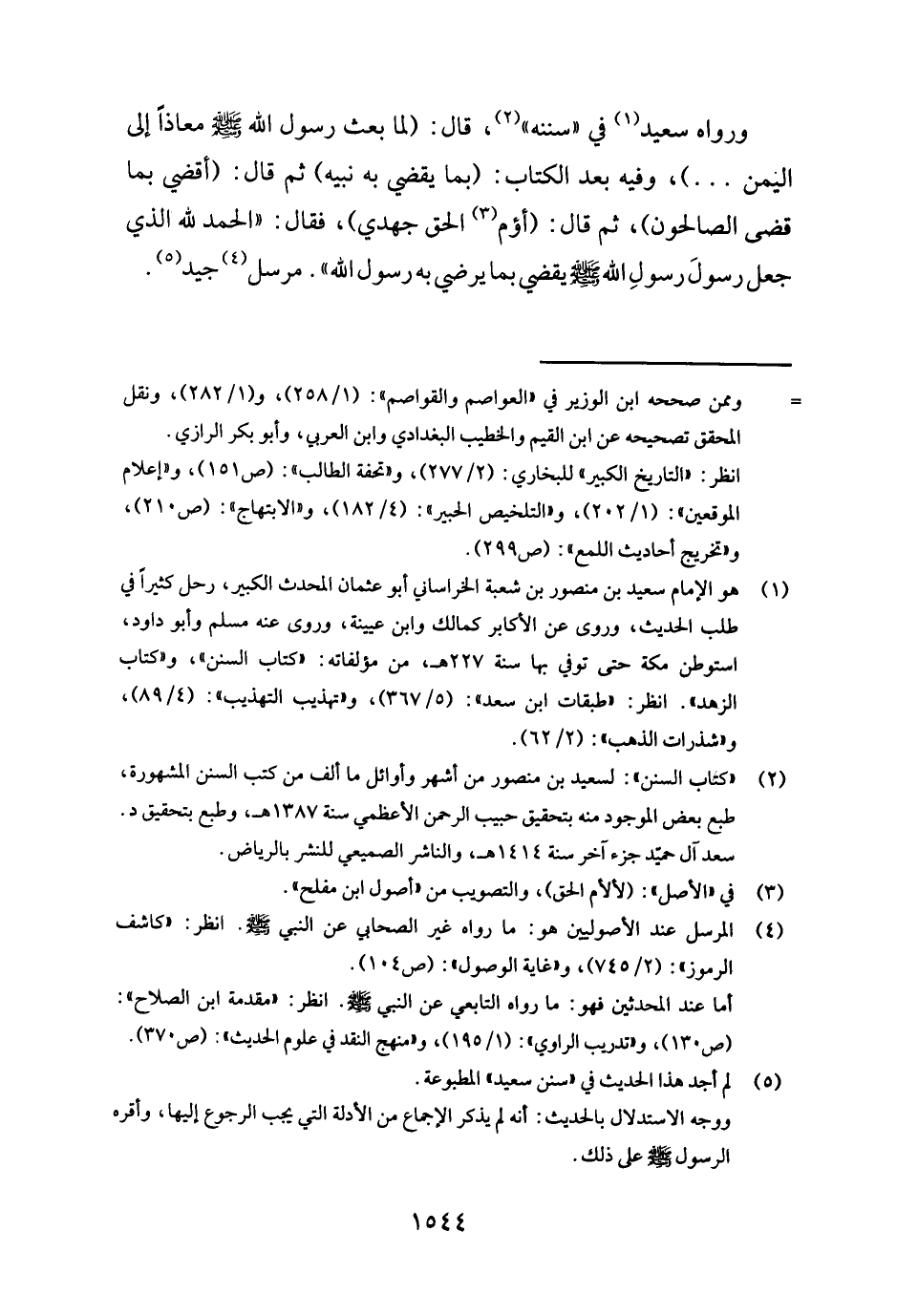 وَرَوَاهُ سعيد فِي " سنَنه "، قَالَ: (لما بعث رَسُول الله - صَلَّى اللَّهُ عَلَيْهِ وَسَلَّم َ - معَاذًا إِلَى الْيمن) ، وَفِيه بعد الْكتاب: (بِمَا يقْضِي بِهِ نبيه) ثمَّ قَالَ: (أَقْْضِي بِمَا قضى الصالحون) ، ثمَّ قَالَ: (أؤم الْحق جهدي) ، فَقَالَ: " الْحَمد لله الَّذِي جعل رَسُول رَسُول الله - صَلَّى اللَّهُ عَلَيْهِ وَسَلَّم َ - يقْضِي بِمَا يُرْضِي بِهِ رَسُول الله ". مُرْسل جيد.