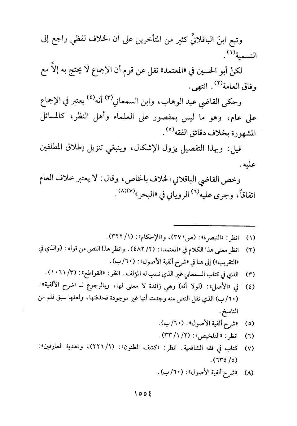 وَتبع ابْن الباقلاني كثير من الْمُتَأَخِّرين على أَن الْخلاف لَفْظِي رَاجع إِلَى التَّسْمِيَة.