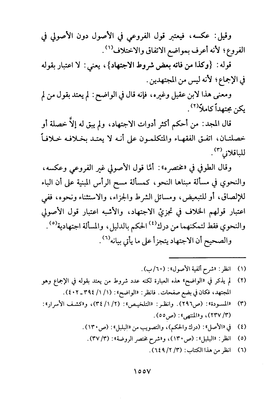 وَقَالَ الطوفي فِي " مُخْتَصره ": أما قَول الأصولي غير الفروعي وَعَكسه، والنحوي فِي مَسْأَلَة مبناها النَّحْو، كَمَسْأَلَة مسح الرَّأْس المبنية على أَن الْبَاء للإلصاق، أَو للتَّبْعِيض، ومسائل الشَّرْط وَالْجَزَاء، وَالِاسْتِثْنَاء وَنَحْوه، فَفِي اعْتِبَار قَوْلهم الْخلاف فِي تجزيء الِاجْتِهَاد، وَالْأَشْبَه اعْتِبَار قَول الأصولي والنحوي فَقَط لتمكنهما من دَرك الحكم بِالدَّلِيلِ، وَالْمَسْأَلَة اجتهادية. وَالصَّحِيح أَن الِاجْتِهَاد يتَجَزَّأ على مَا يَأْتِي بَيَانه.