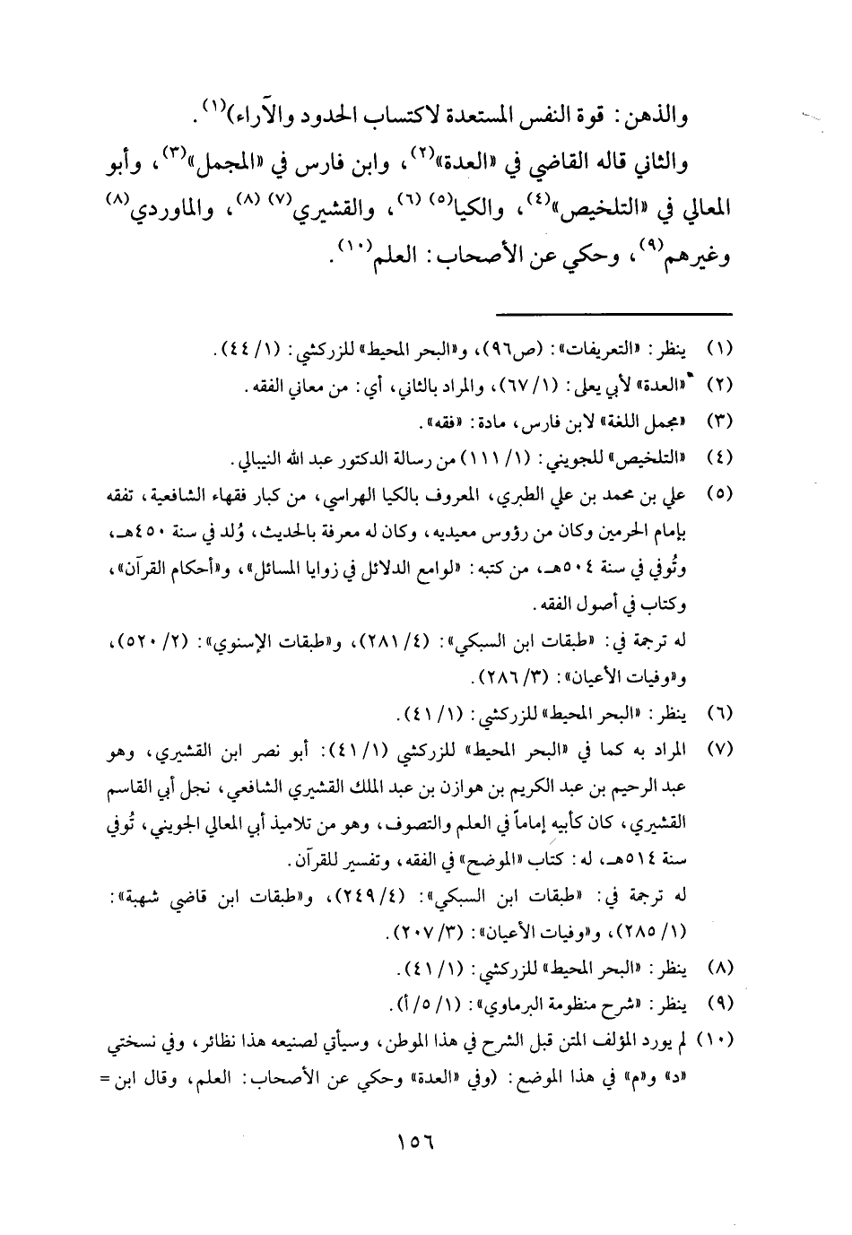 وَالثَّانِي قَالَه القَاضِي فِي " الْعدة "، وَابْن فَارس فِي " الْمُجْمل "، وَأَبُو الْمَعَالِي فِي " التخليص "، والكيا، والقشيري، وَالْمَاوَرْدِيّ وَغَيرهم، وَحكي عَن الْأَصْحَاب: الْعلم.