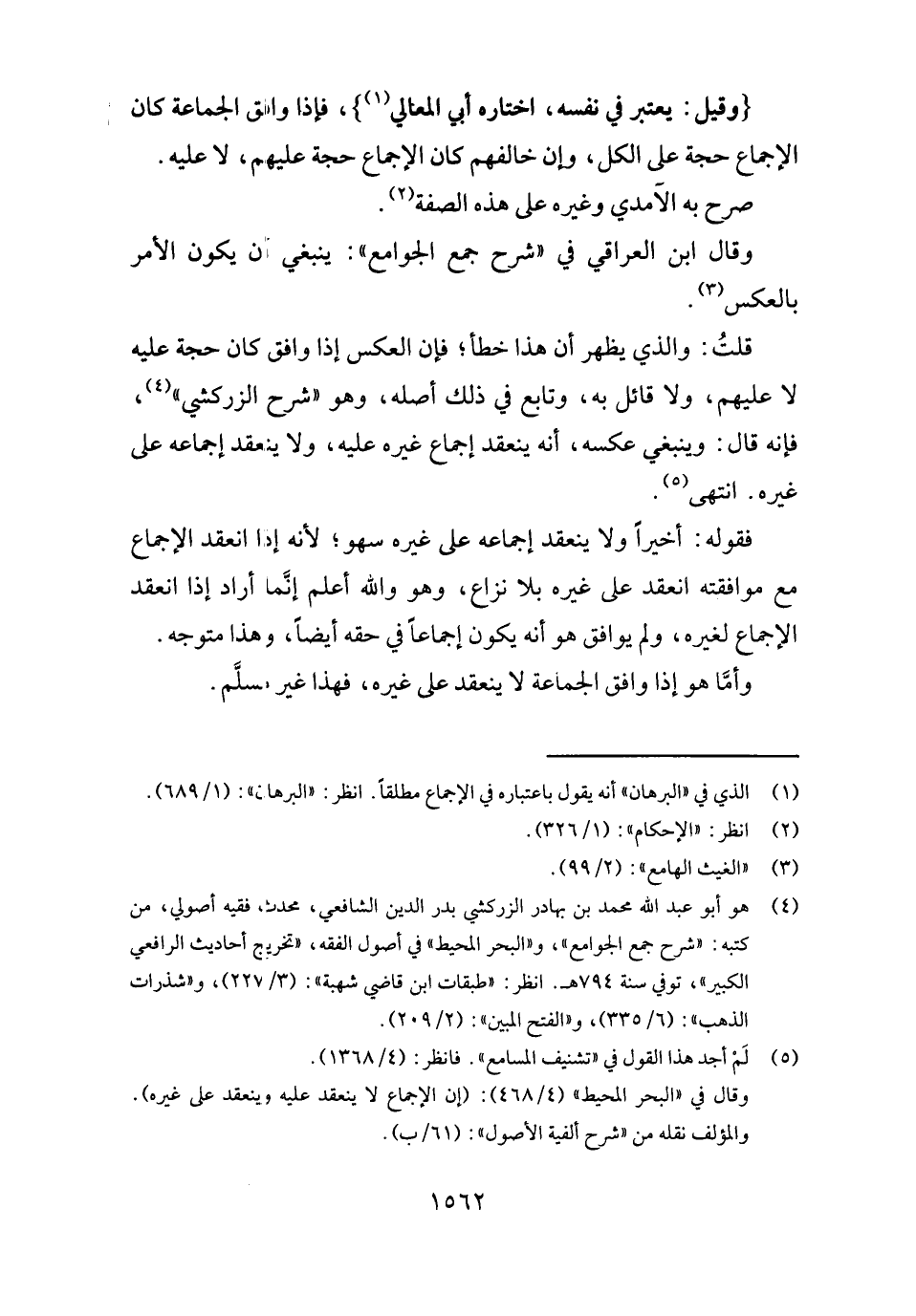 فَقَوله: أخيراً وَلَا ينْعَقد إجماعه على غَيره سَهْو؛ لِأَنَّهُ إِذا انْعَقَد الْإِجْمَاع مَعَ مُوَافَقَته انْعَقَد على غَيره بِلَا نزاع، وَهُوَ وَالله أعلم إِنَّمَا أَرَادَ إِذا انْعَقَد الْإِجْمَاع لغيره، وَلم يُوَافق هُوَ أَنه يكون إِجْمَاعًا فِي حَقه أَيْضا، وَهَذَا مُتَوَجّه؟