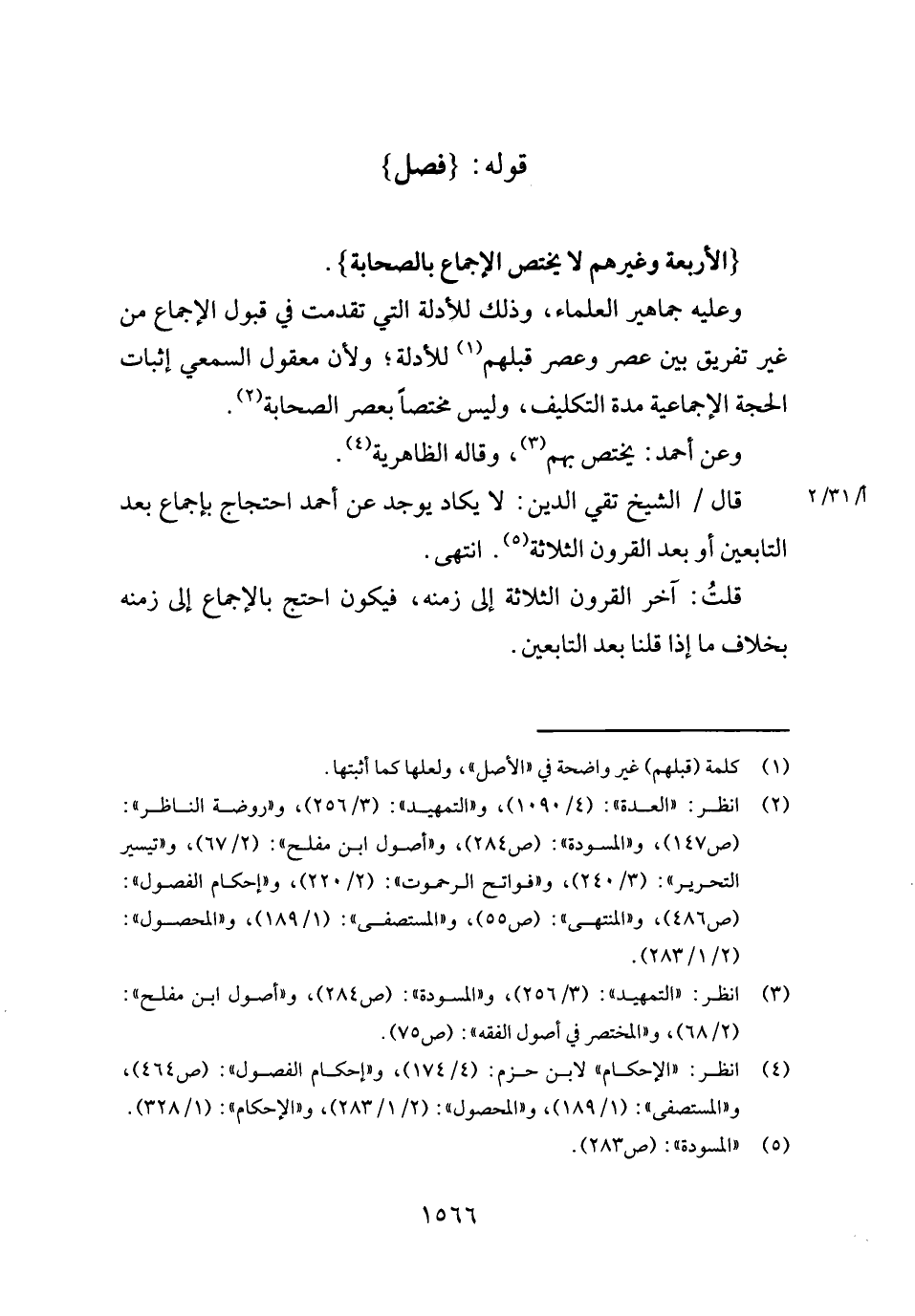 قلت: آخر الْقُرُون الثَّلَاثَة إِلَى زَمَنه، فَيكون احْتج بِالْإِجْمَاع إِلَى زَمَنه بِخِلَاف مَا إِذا قُلْنَا بعد التَّابِعين.