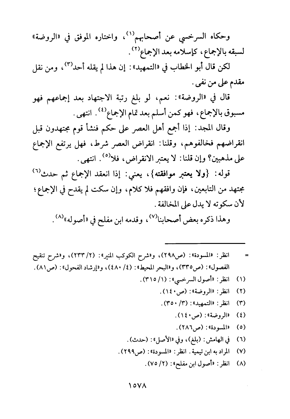 وَحَكَاهُ السَّرخسِيّ عَن أَصْحَابهم، وَاخْتَارَهُ الْمُوفق فِي " الرَّوْضَة " لسبقه بِالْإِجْمَاع، كإسلامه بعد الْإِجْمَاع.