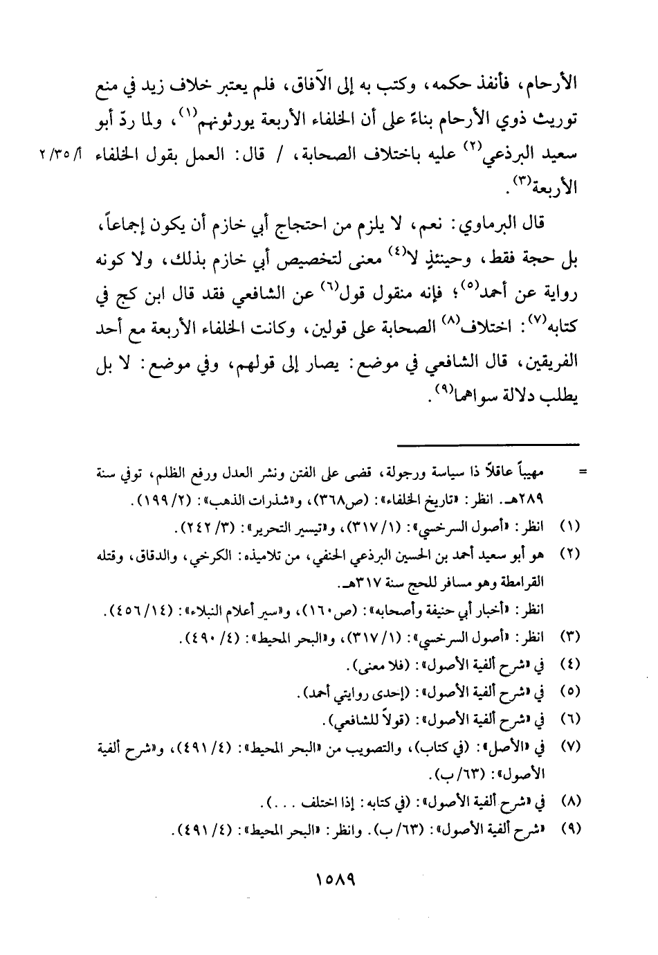 الْأَرْحَام، فأنفذ حكمه، وَكتب بِهِ إِلَى الْآفَاق، فَلم يعْتَبر خلاف زيد فِي منع تَوْرِيث ذَوي الْأَرْحَام بِنَاء على أَن الْخُلَفَاء الْأَرْبَعَة يورثونهم، وَلما رد أَبُو سعيد البرذعي عَلَيْهِ باخْتلَاف الصَّحَابَة، قَالَ: الْعَمَل بقول الْخُلَفَاء الْأَرْبَعَة.