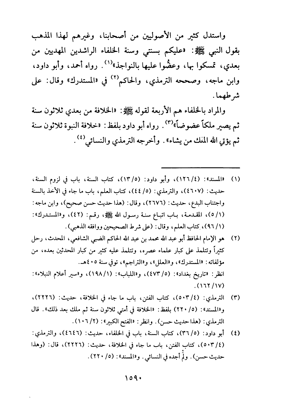 وَاسْتدلَّ كثير من الْأُصُولِيِّينَ من أَصْحَابنَا، وَغَيرهم لهَذَا الْمَذْهَب بقول النَّبِي - صَلَّى اللَّهُ عَلَيْهِ وَسَلَّم َ -: " عَلَيْكُم بِسنتي وَسنة الْخُلَفَاء الرَّاشِدين المهديين من بعدِي، تمسكوا بهَا، وعضوا عَلَيْهَا بالنواجذ ". رَوَاهُ أَحْمد، وَأَبُو دَاوُد، وَابْن مَاجَه، وَصَححهُ التِّرْمِذِيّ، وَالْحَاكِم فِي " الْمُسْتَدْرك " وَقَالَ: على شَرطهمَا.