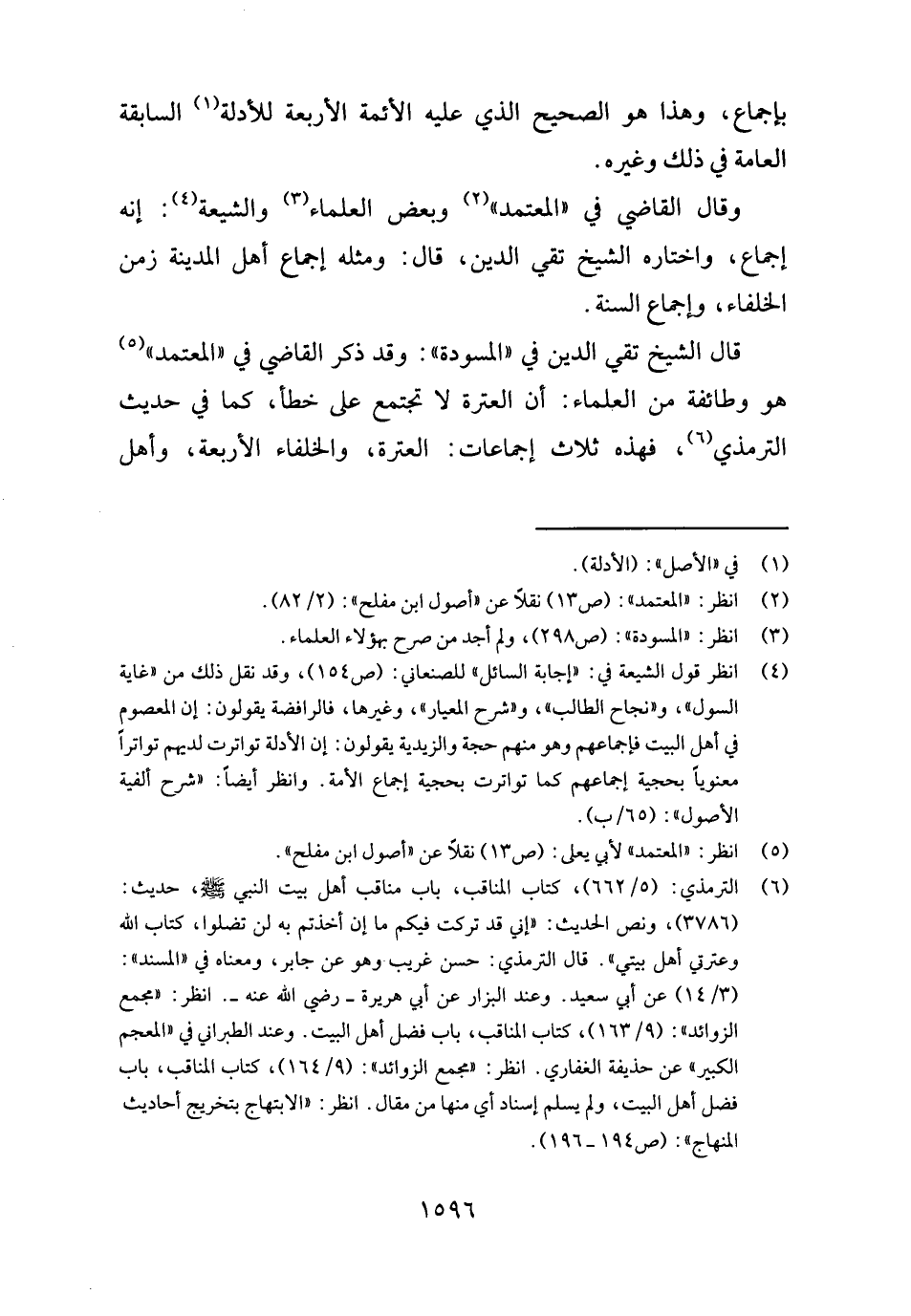 قَالَ الشَّيْخ تَقِيّ الدّين فِي " المسودة ": وَقد ذكر القَاضِي فِي " الْمُعْتَمد " هُوَ وَطَائِفَة من الْعلمَاء: أَن العترة لَا تَجْتَمِع على خطأ، كَمَا فِي حَدِيث التِّرْمِذِيّ، فَهَذِهِ ثَلَاث إجماعات: العترة، وَالْخُلَفَاء الْأَرْبَعَة، وَأهل