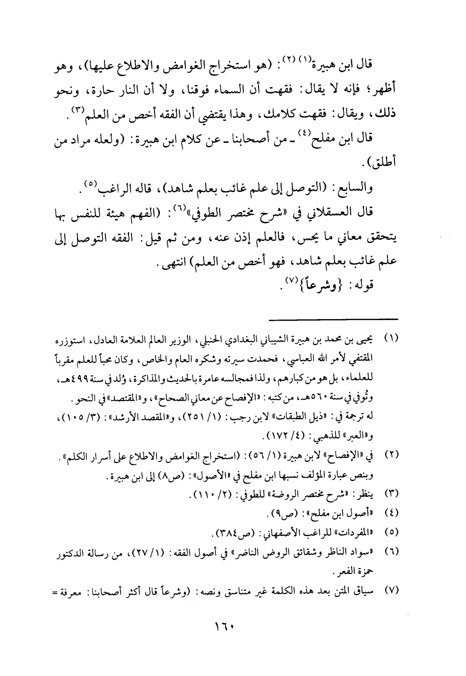 قَالَ ابْن هُبَيْرَة: (هُوَ اسْتِخْرَاج الغوامض والاطلاع عَلَيْهَا) ، وَهُوَ أظهر؛ فَإِنَّهُ لَا يُقَال: فقهت أَن السَّمَاء فَوْقنَا، وَلَا أَن النَّار حارة، وَنَحْو ذَلِك، وَيُقَال: فقهت كلامك، وَهَذَا يَقْتَضِي أَن الْفِقْه أخص من الْعلم.