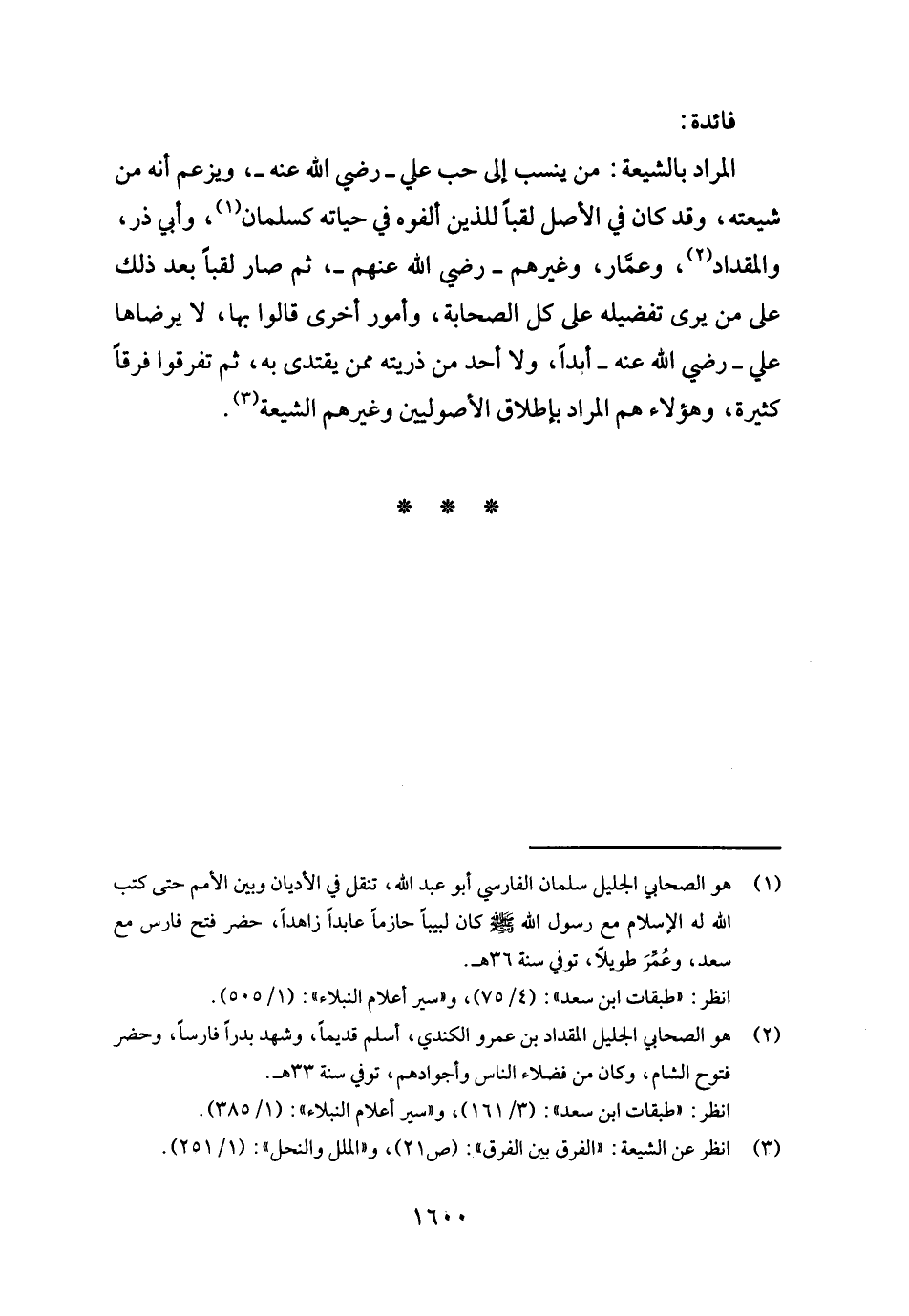 المُرَاد بالشيعة: من ينْسب إِلَى حب عَليّ - رَضِي الله عَنهُ -، وَيَزْعُم أَنه من شيعته، وَقد كَانَ فِي الأَصْل لقباً للَّذين ألفوه فِي حَيَاته كسلمان، وَأبي ذَر، والمقداد، وعمار، وَغَيرهم - رَضِي الله عَنْهُم -، ثمَّ صَار لقباً بعد ذَلِك على من يرى تفضيله على كل الصَّحَابَة، وَأُمُور أُخْرَى قَالُوا بهَا، لَا يرضاها عَليّ - رَضِي الله عَنهُ - أبدا، وَلَا أحد من ذُريَّته مِمَّن يقْتَدى بِهِ، ثمَّ تفَرقُوا فرقا كَثِيرَة، وَهَؤُلَاء هم المُرَاد بِإِطْلَاق الْأُصُولِيِّينَ وَغَيرهم الشِّيعَة.