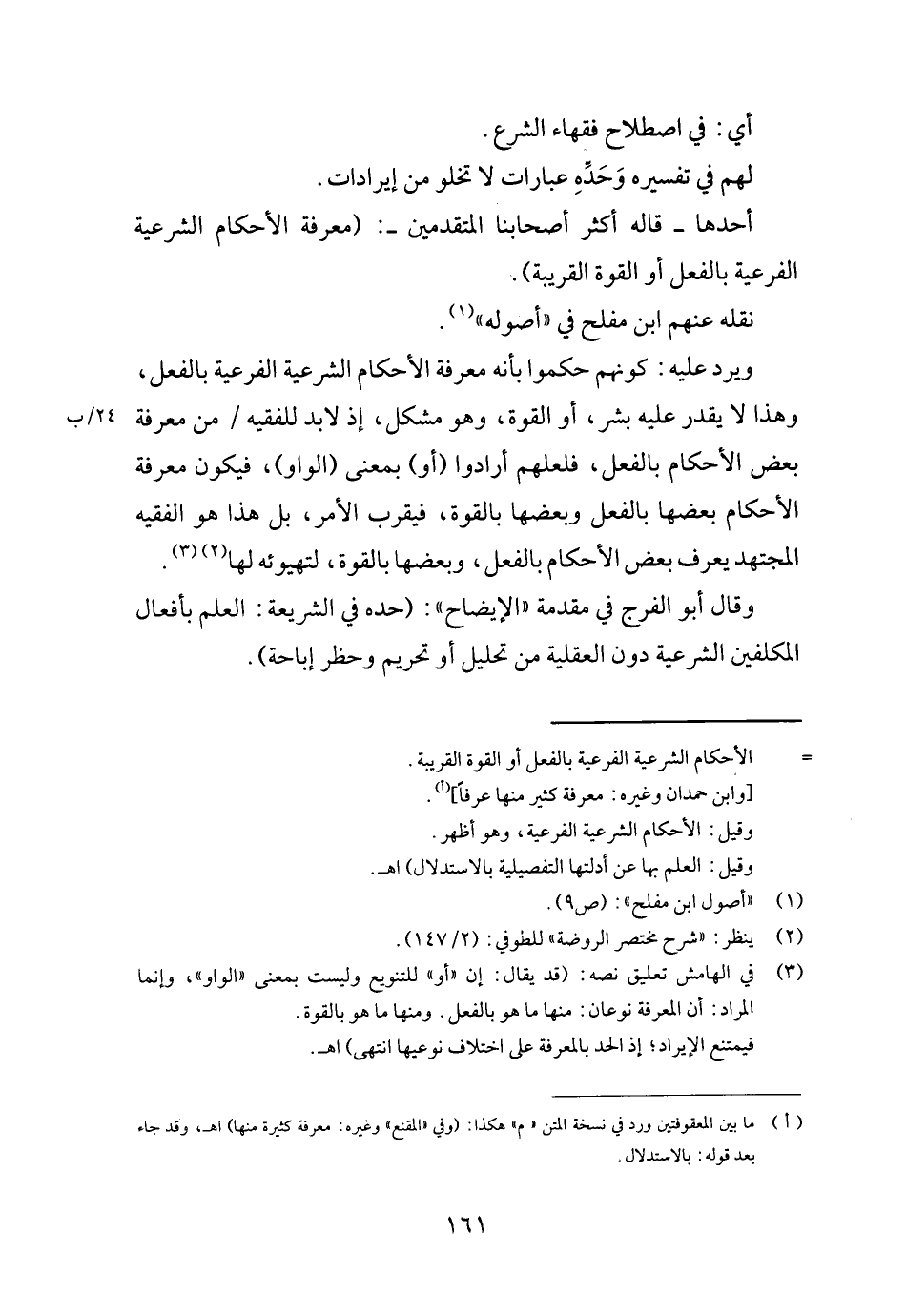 وَيرد عَلَيْهِ: كَونهم حكمُوا بِأَنَّهُ معرفَة الْأَحْكَام الشَّرْعِيَّة الفرعية بِالْفِعْلِ، وَهَذَا لَا يقدر عَلَيْهِ بشر، أَو الْقُوَّة، وَهُوَ مُشكل، إِذْ لَا بُد للفقيه / من معرفَة بعض الْأَحْكَام بِالْفِعْلِ، فلعلهم أَرَادوا (أَو) بِمَعْنى (الْوَاو) ، فَيكون معرفَة الْأَحْكَام بَعْضهَا بِالْفِعْلِ وَبَعضهَا بِالْقُوَّةِ، فَيقرب الْأَمر، بل هَذَا هُوَ الْفَقِيه الْمُجْتَهد يعرف بعض الْأَحْكَام بِالْفِعْلِ، وَبَعضهَا بِالْقُوَّةِ، لتهيوئه لَهَا.
