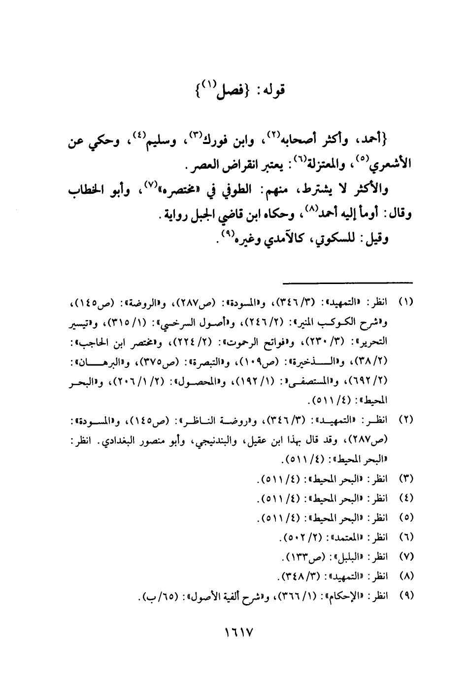 {أَحْمد، وَأكْثر أَصْحَابه، وَابْن فورك، وسليم، وَحكي عَن الْأَشْعَرِيّ، والمعتزلة: يعْتَبر انْقِرَاض الْعَصْر.