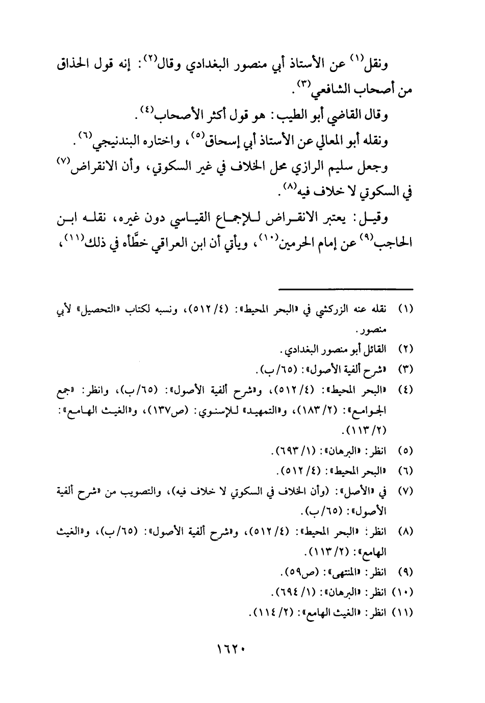 وَنَقله أَبُو الْمَعَالِي عَن الْأُسْتَاذ أبي إِسْحَاق، وَاخْتَارَهُ الْبَنْدَنِيجِيّ. وَجعل سليم الرَّازِيّ مَحل الْخلاف فِي غير السكوتي، وَأَن الانقراض فِي السكوتي لَا خلاف فِيهِ.