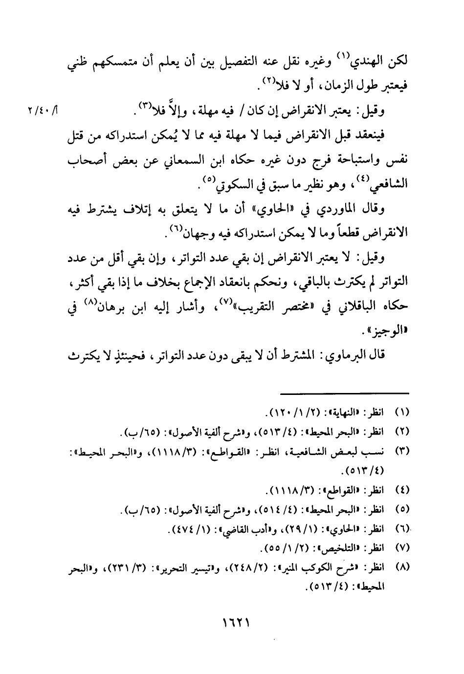 لَكِن الْهِنْدِيّ وَغَيره نقل عَنهُ التَّفْصِيل بَين أَن يعلم أَن متمسكهم ظَنِّي فَيعْتَبر طول الزَّمَان، أَو لَا فَلَا.