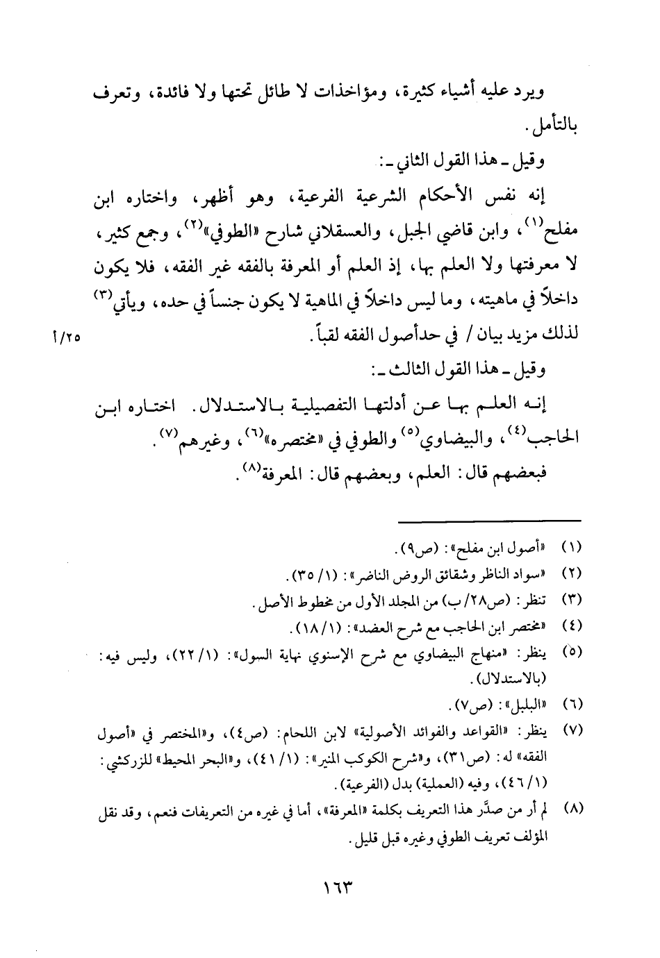 إِنَّه الْعلم بهَا عَن أدلتها التفصيلية بالاستدلال. اخْتَارَهُ ابْن الْحَاجِب، والبيضاوي والطوفي فِي " مُخْتَصره "، وَغَيرهم.