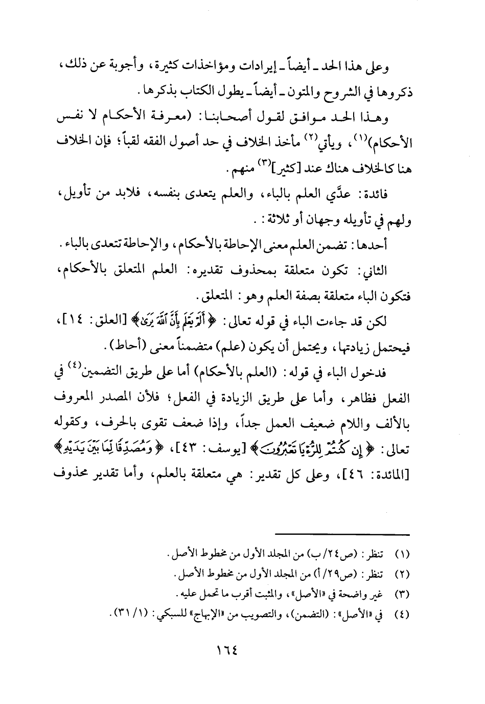 فدخول الْبَاء فِي قَوْله: (الْعلم بِالْأَحْكَامِ) أما على طَرِيق التَّضْمِين فِي الْفِعْل فَظَاهر، وَأما على طَرِيق الزِّيَادَة فِي الْفِعْل؛ فَلِأَن الْمصدر الْمَعْرُوف بِالْألف وَاللَّام ضَعِيف الْعَمَل جدا، وَإِذا ضعف تقوى بالحرف، وَكَقَوْلِه تَعَالَى: {إِن كُنْتُم للرءيا تعبرون} [يُوسُف: ٤٣] ، {ومصدقاً لما بَين يَدَيْهِ} [الْمَائِدَة: ٤٦] ، وعَلى كل تَقْدِير: هِيَ مُتَعَلقَة بِالْعلمِ، وَأما تَقْدِير مَحْذُوف