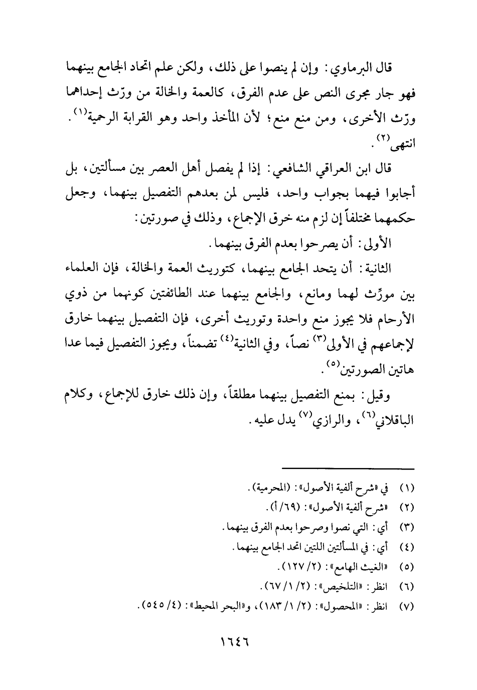 قَالَ ابْن الْعِرَاقِيّ الشَّافِعِي: إِذا لم يفصل أهل الْعَصْر بَين مَسْأَلَتَيْنِ، بل أجابوا فيهمَا بِجَوَاب وَاحِد، فَلَيْسَ لمن بعدهمْ التَّفْصِيل بَينهمَا، وَجعل حكمهمَا مُخْتَلفا إِن لزم مِنْهُ خرق الْإِجْمَاع، وَذَلِكَ فِي صُورَتَيْنِ: