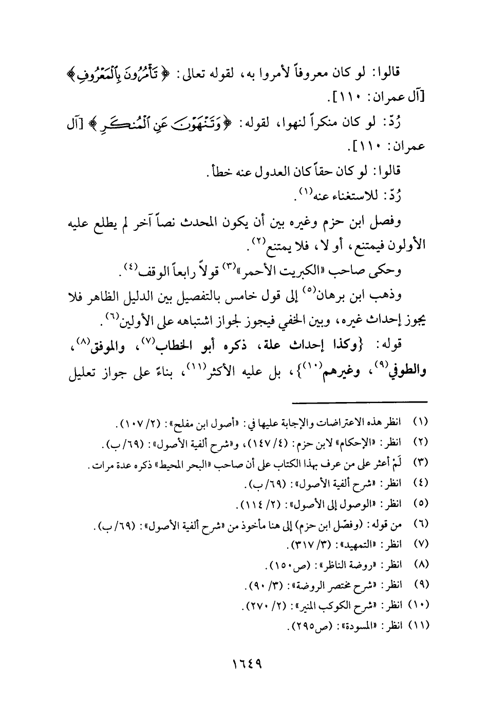 قَوْله: {وَكَذَا إِحْدَاث عِلّة، ذكره أَبُو الْخطاب، والموفق، والطوفي، وَغَيرهم} ، بل عَلَيْهِ الْأَكْثَر، بِنَاء على جَوَاز تَعْلِيل