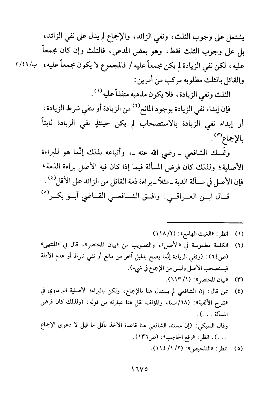 فَإِن إبداء نفي الزِّيَادَة بِوُجُود الْمَانِع من الزِّيَادَة أَو بِنَفْي شَرط الزِّيَادَة، أَو إبداء نفي الزِّيَادَة بالاستصحاب لم يكن حِينَئِذٍ نفي الزِّيَادَة ثَابتا بِالْإِجْمَاع.
