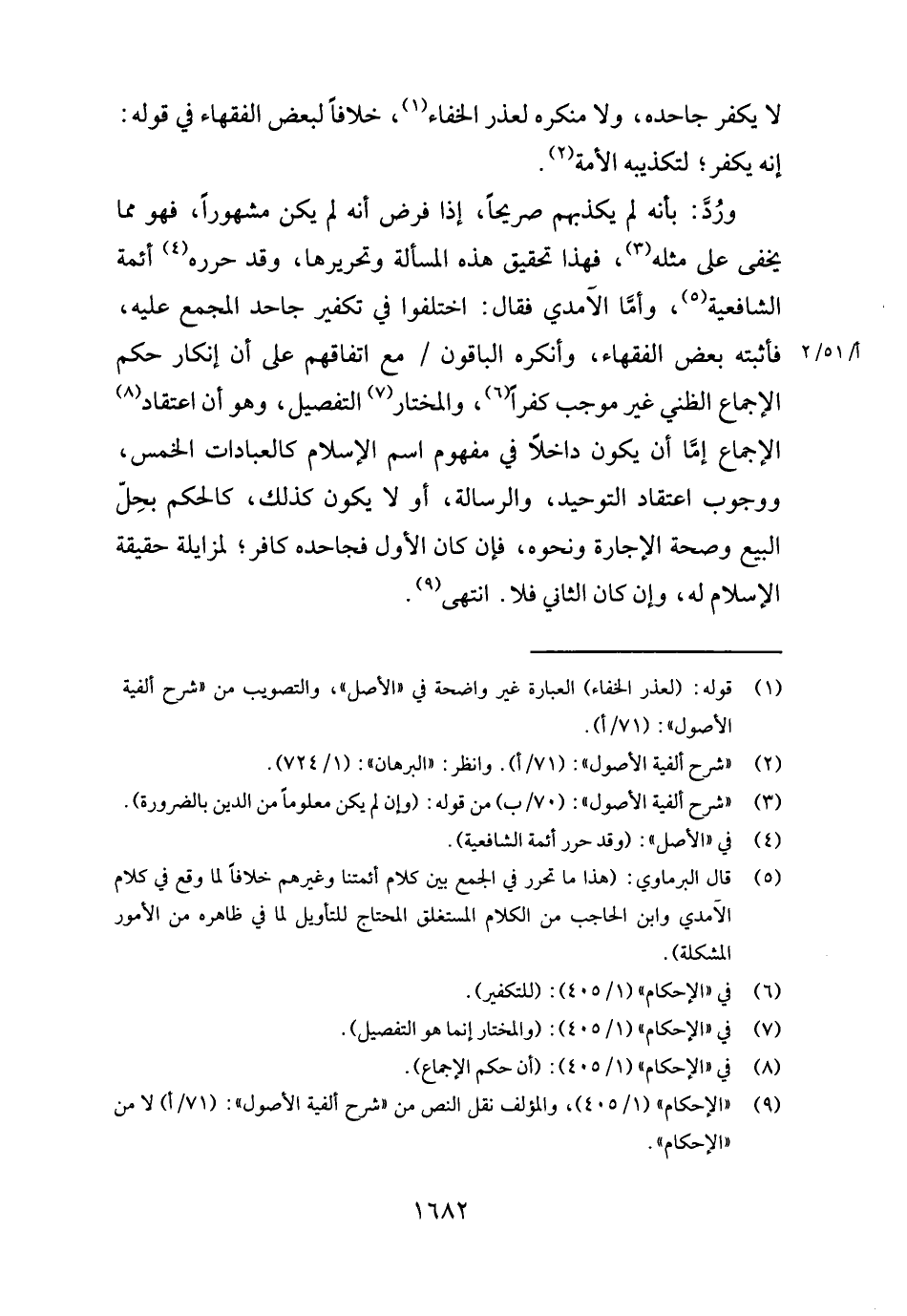 ورد: بِأَنَّهُ لم يكذبهم صَرِيحًا، إِذا فرض أَنه لم يكن مَشْهُورا، فَهُوَ مِمَّا يخفى على مثله، فَهَذَا تَحْقِيق هَذِه الْمَسْأَلَة وتحريرها، وَقد حَرَّره أَئِمَّة الشَّافِعِيَّة، وَأما الْآمِدِيّ فَقَالَ: اخْتلفُوا فِي تَكْفِير جَاحد الْمجمع عَلَيْهِ، فأثبته بعض الْفُقَهَاء، وَأنْكرهُ الْبَاقُونَ مَعَ اتِّفَاقهم على أَن إِنْكَار حكم الْإِجْمَاع الظني غير مُوجب كفرا، وَالْمُخْتَار التَّفْصِيل، وَهُوَ أَن اعْتِقَاد الْإِجْمَاع إِمَّا أَن يكون دَاخِلا فِي مَفْهُوم اسْم الْإِسْلَام كالعبادات الْخمس، وَوُجُوب اعْتِقَاد التَّوْحِيد، والرسالة، أَو لَا يكون كَذَلِك، كَالْحكمِ بِحل البيع وَصِحَّة الْإِجَارَة وَنَحْوه، فَإِن كَانَ الأول فجاحده كَافِر؛ لمزايلة حَقِيقَة الْإِسْلَام لَهُ، وَإِن كَانَ الثَّانِي فَلَا. انْتهى.